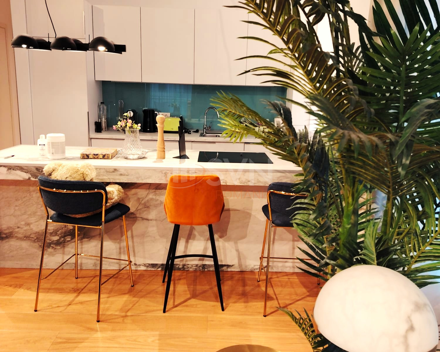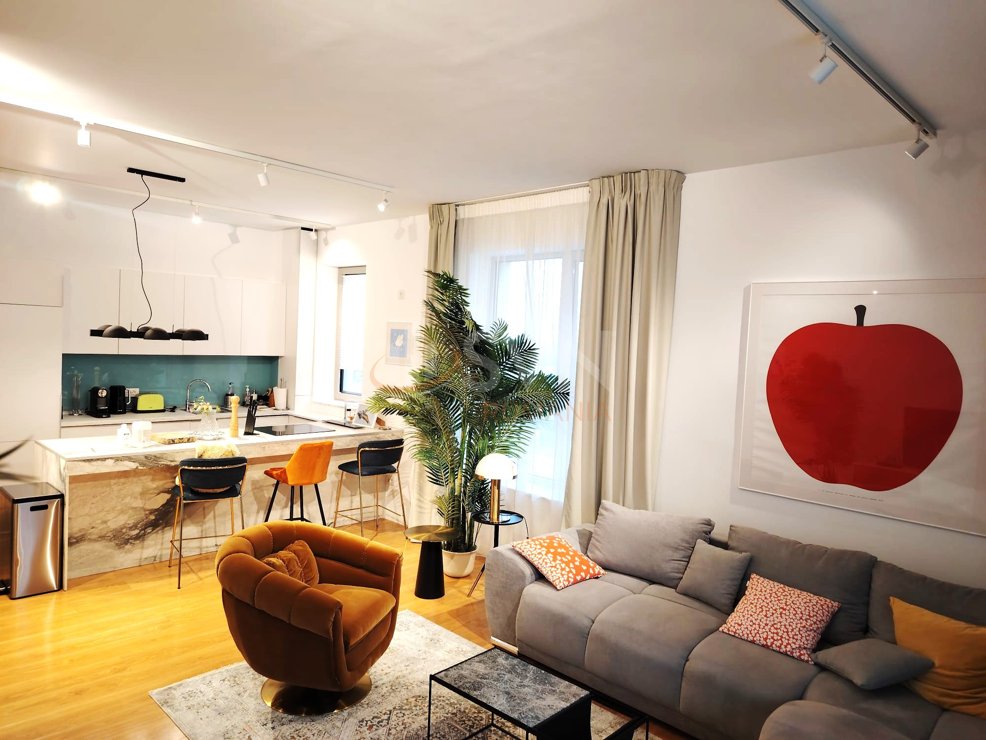 Zona de zi impresioneaza prin lumina naturala si vederea panoramica catre Manastirea Casin si parcul interior al complexului. Bucataria este complet utilata si pregatita pentru utilizare imediata, inclusiv cu vesela si accesorii necesare gatitului. Dormitorul matrimonial beneficiaza de baie en suite cu cada, iar baia secundara este dotata cu dus si masina de spalat rufe. Un avantaj important este faptul ca ambele bai dispun de ferestre pentru ventilatie naturala.
