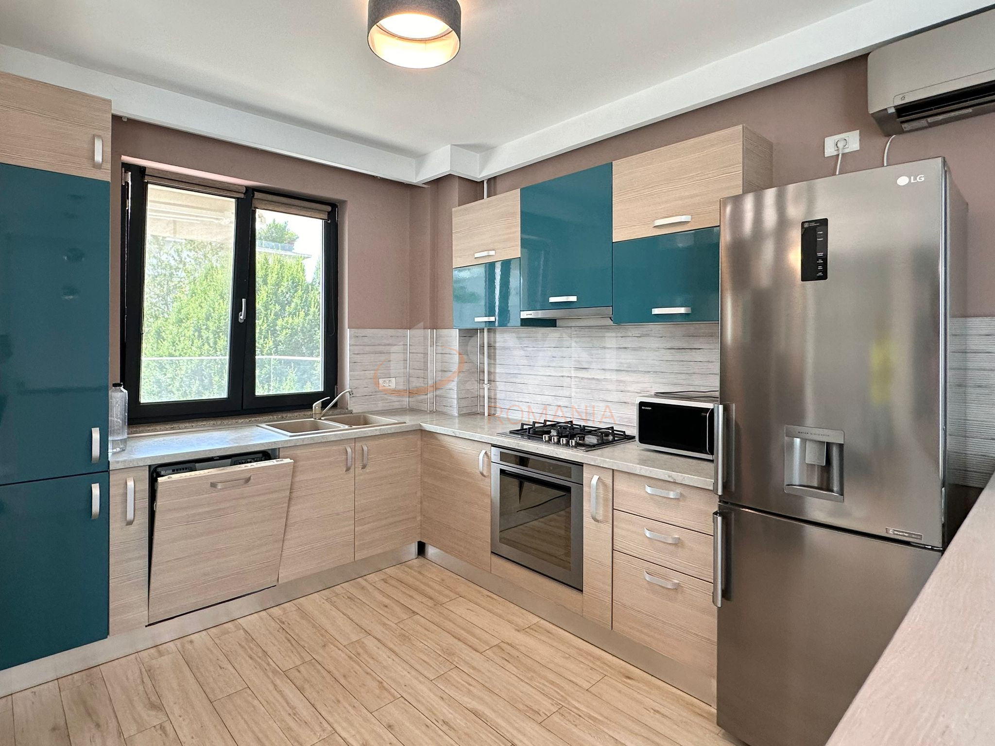 Apartamentul este complet mobilat si utilat si dispune de incalzire in pardoseala, aer conditionat, masina de spalat vase, cuptor, plita, hota, frigider, cuptor cu microunde si masina de spalat.