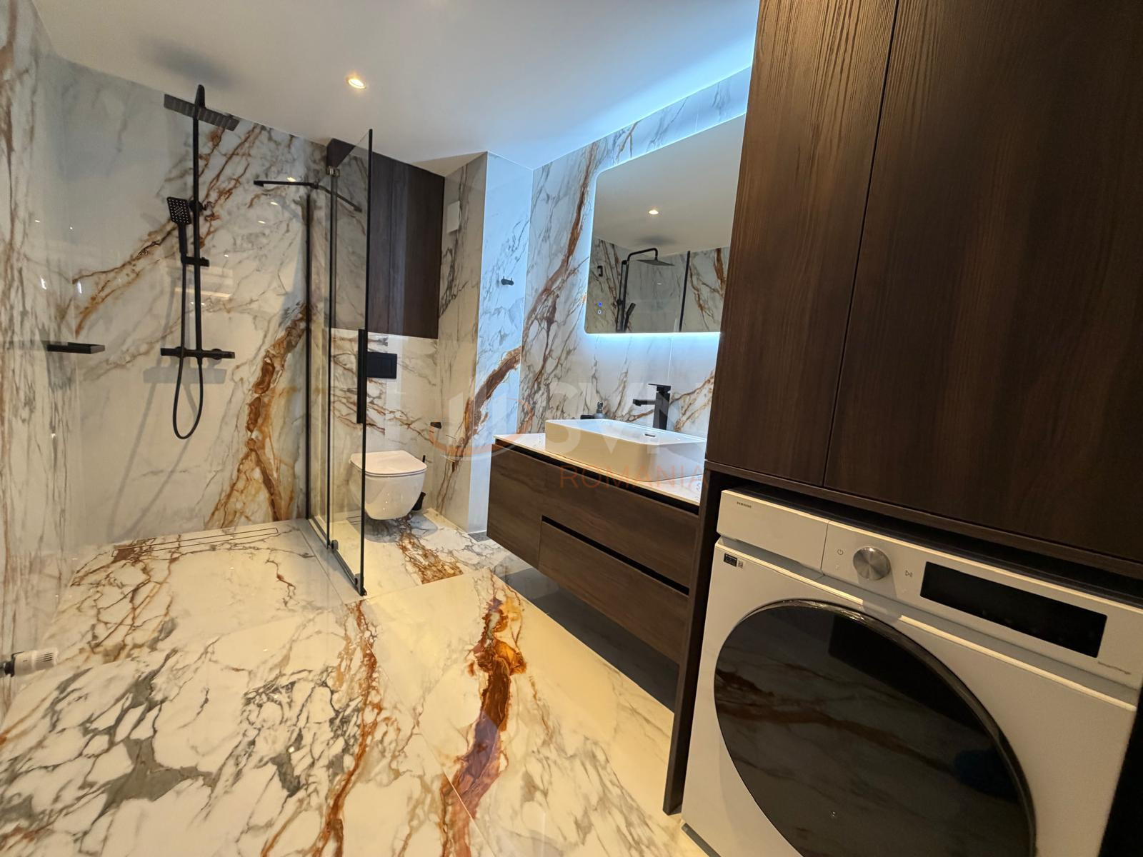 Locuinta beneficiaza de un pachet complet de electrocasnice noi, premium: cuptor profesional, cuptor cu microunde, wine cooler adus din Franta, masina de spalat cu uscator, masina de spalat vase, hota moderna, aer conditionat si multe alte dotari menite sa ofere confort deplin.