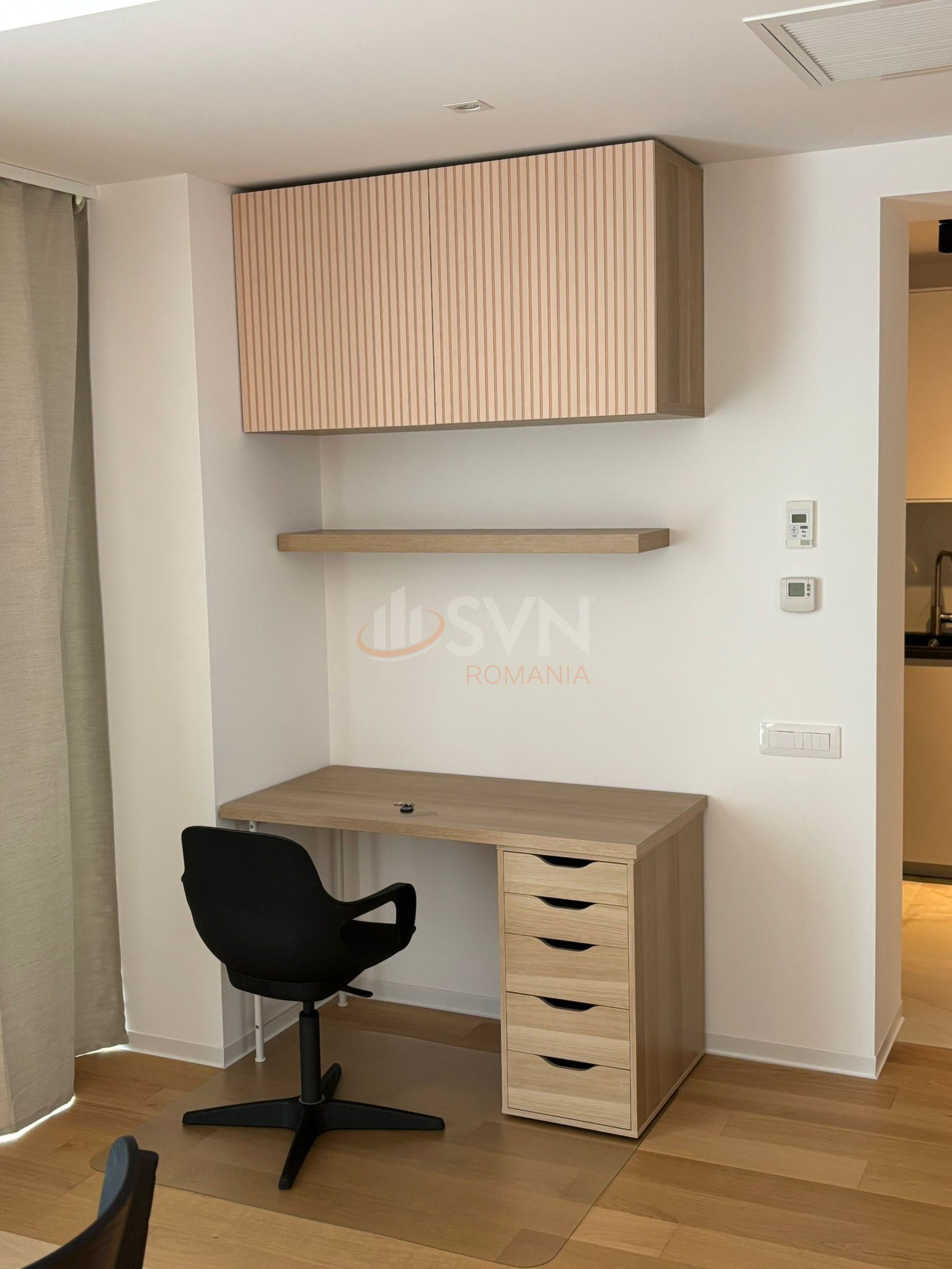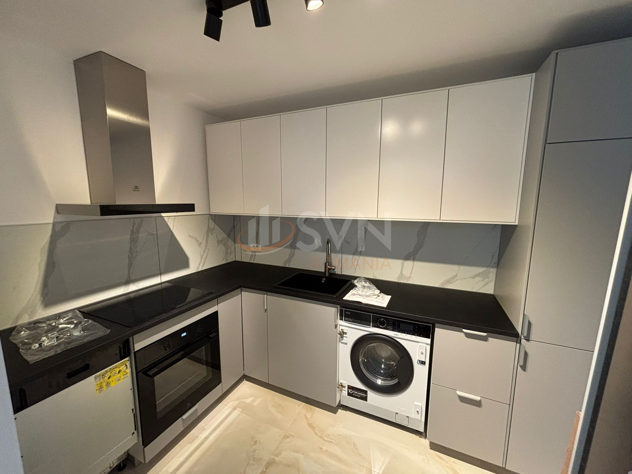 Spațiul de living este amenajat inteligent în trei zone distincte: o zonă de dining, o zonă de relaxare dotată cu Smart TV și o zonă de lucru ideală pentru work-from-home. Dormitorul este confortabil și luminos, iar bucătăria este complet mobilată și utilată cu electrocasnice moderne. Apartamentul beneficiază de mobilier contemporan, finisaje premium, încălzire în pardoseală și sistem de aer condiționat pentru întregul apartament. De asemenea, locuința este echipată cu mașină de spălat și Smart TV.