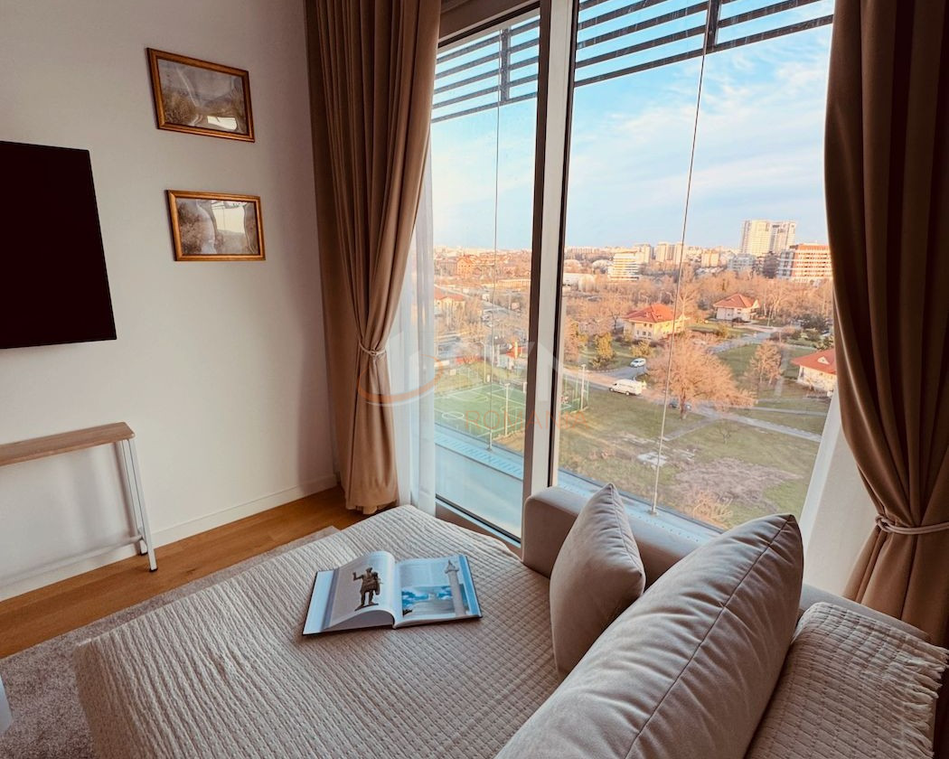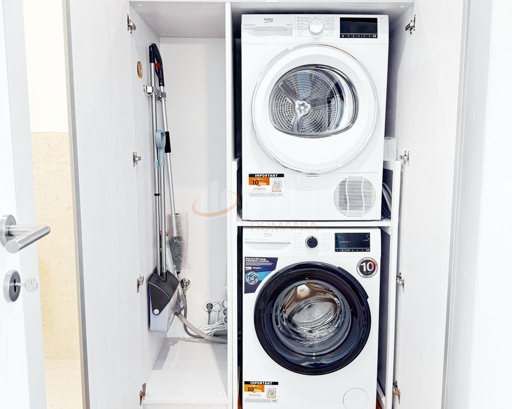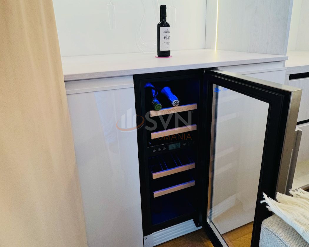 Zona de living este amenajată cu bun gust și include o zonă de bar cu frigider pentru vinuri, precum și un dressing generos, care oferă spațiu suplimentar de depozitare și contribuie la funcționalitatea excelentă a apartamentului. Bucătăria este complet echipată cu electrocasnice noi, încorporate, și răspunde perfect cerințelor unui stil de viață modern: