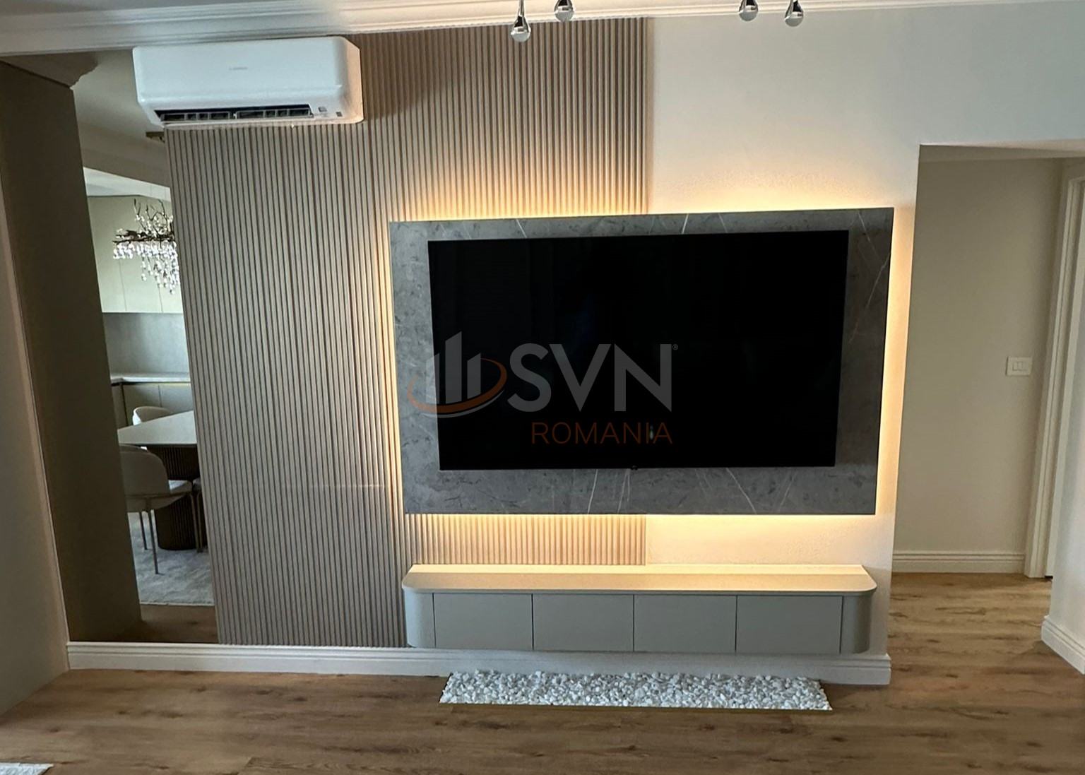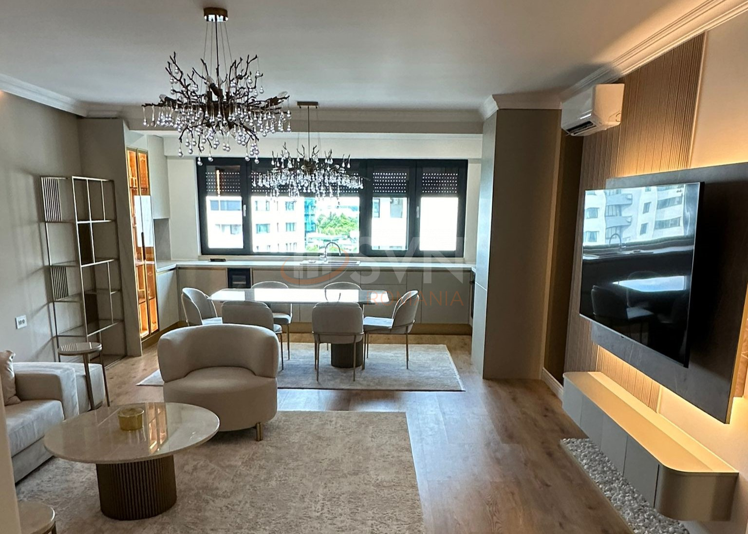 Apartamentul este complet nou, cu toate dotarile in garantie (24 luni), si este amenajat cu finisaje premium si materiale atent alese. Interiorul impresioneaza prin detalii elegante precum obiecte din marmura, lustre din cristal, canapea din catifea si sistem de iluminat ambiental.