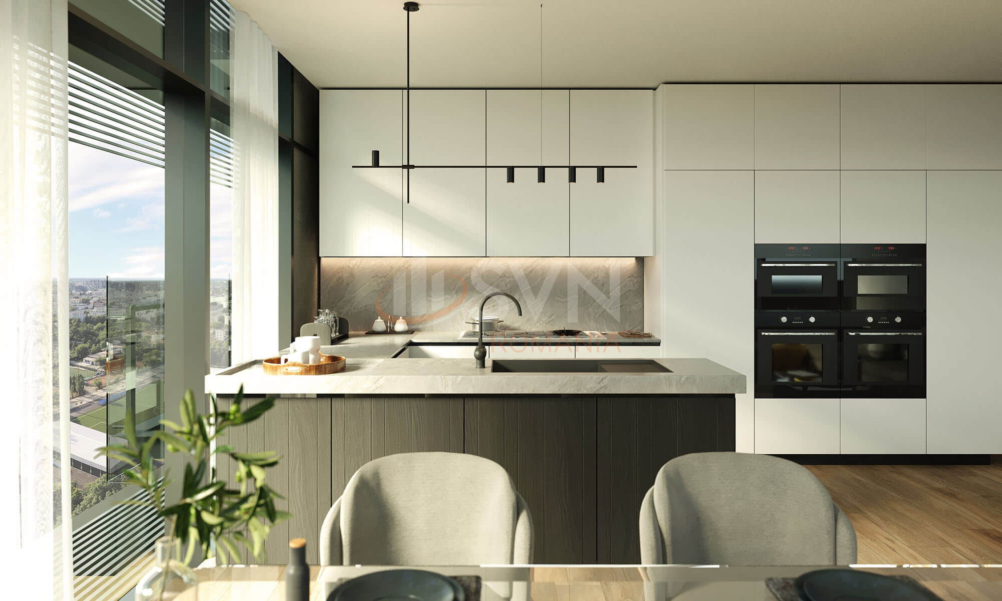 Apartamentul beneficiaza de finisaje de inalta calitate si de avantajele ansamblului: securitate 24/7, parcare subterana, spatii comerciale, sala de fitness si acces rapid catre zonele centrale de business si lifestyle ale orasului.