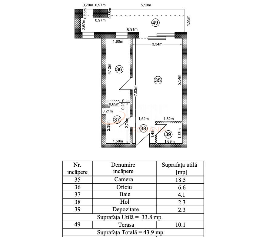 Studio-ul este eficient compartimentat. Camera principala de 18.5 mp este luminoasa si permite amenajarea unei zone de zi si de dormit. Bucataria tip oficiu are o suprafata de 6.6 mp si se preteaza perfect pentru amenajari moderne si practice. Baia are o suprafata de 4.1 mp si este configurata astfel incat sa ofere functionalitate maxima. Holul de 2.3 mp asigura un flux natural intre incaperi, iar spatiul de depozitare de 2.3 mp reprezinta un avantaj important pentru organizarea locuintei. Terasa de 10.1 mp completeaza perfect proprietatea si poate fi amenajata ca zona de relaxare in aer liber.