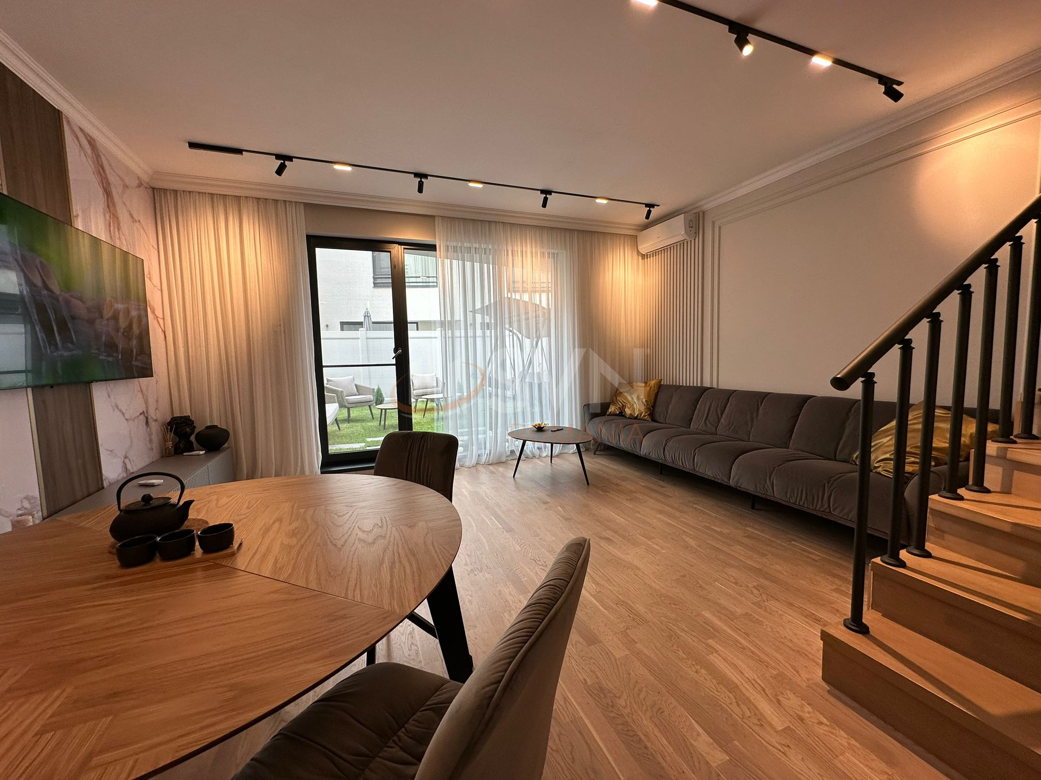 Living cu acces in bucatarie si gradina, curtea ofera foarte multa intimitate, cu plante si copaci inalti, o parte din curte fiind inchisa cu sticla pentru si mai multa intimitate.