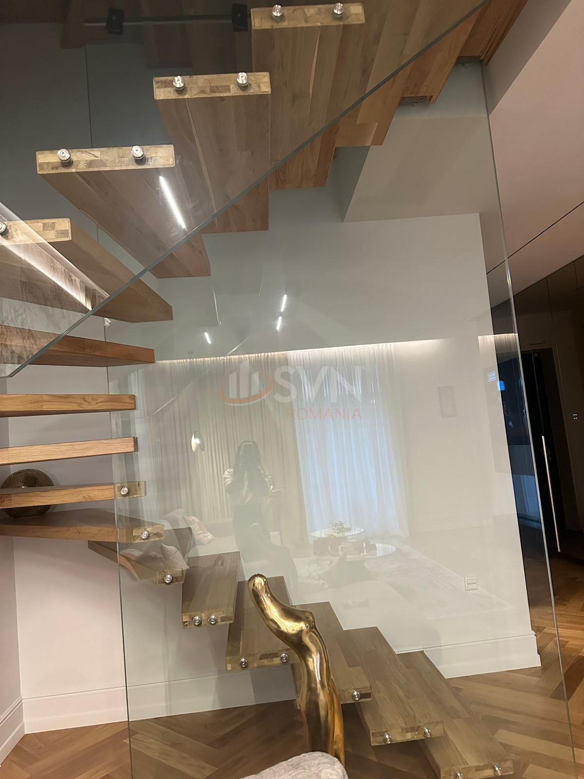 Sistemul smart home KNX permite controlul complet al locuintei de la distanta, iar sistemul de aspiratie centralizata este preinstalat. Designul interior este completat de scara din sticla structurala cu trepte din lemn si usi Filomuro, oferind un aspect elegant si minimalist.