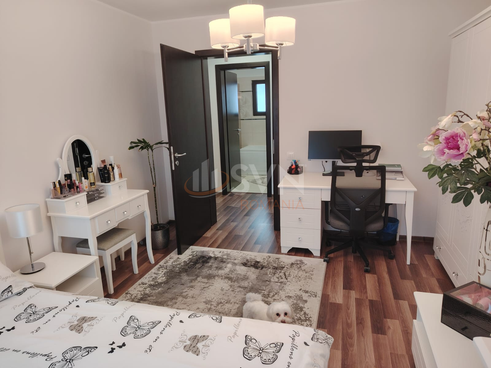 Etajul este compartimentat in dormitor matrimonial cu dressing, baie proprie si balcon, doua dormitoare suplimentare deservite de o baie pe hol, unul dintre acestea beneficiind de balcon.