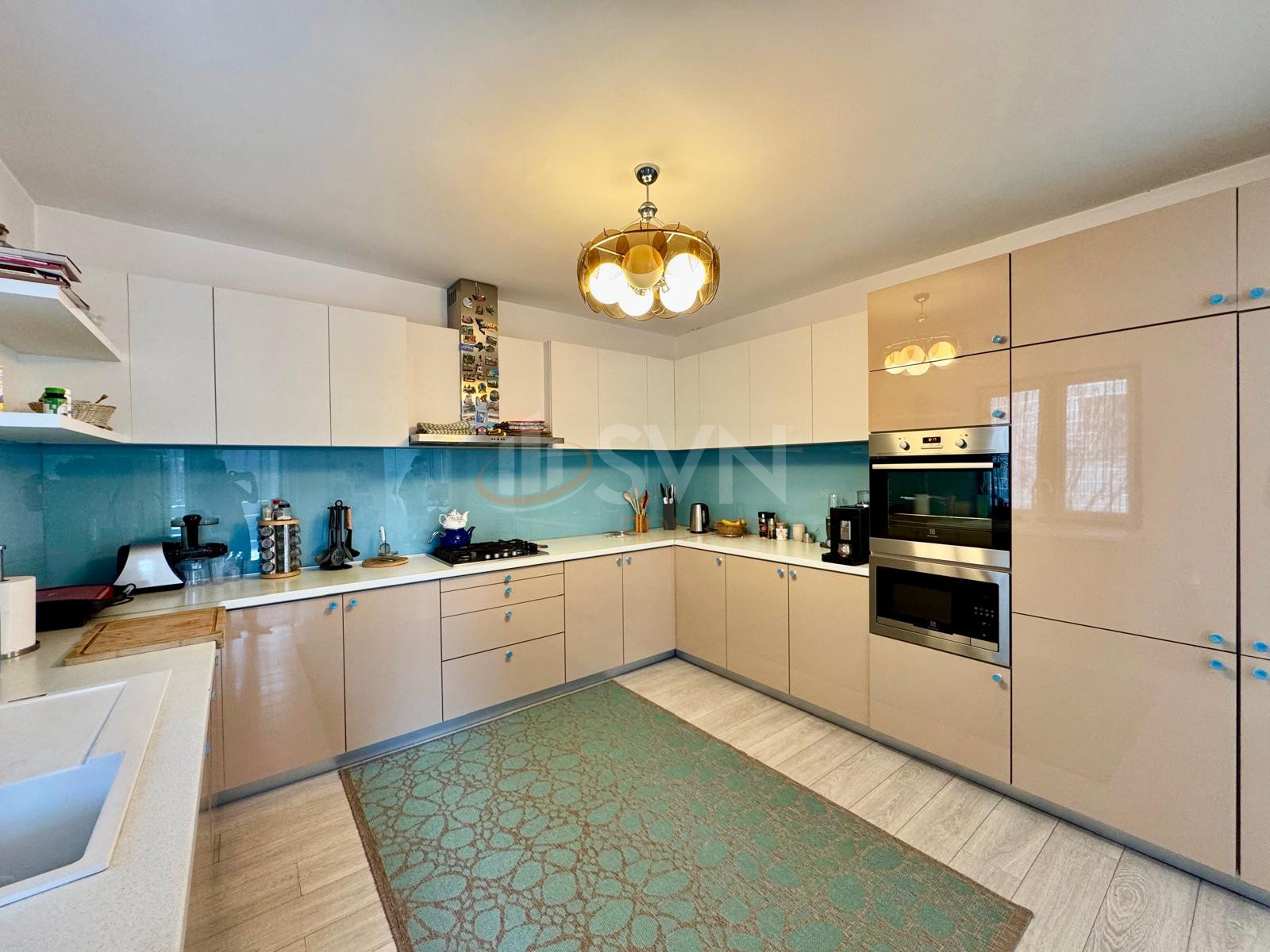 Proprietatea este mobilata cu piese realizate la comanda, incluse in pret, si este dotata cu sistem de alarma, senzori de fum si video interfon.