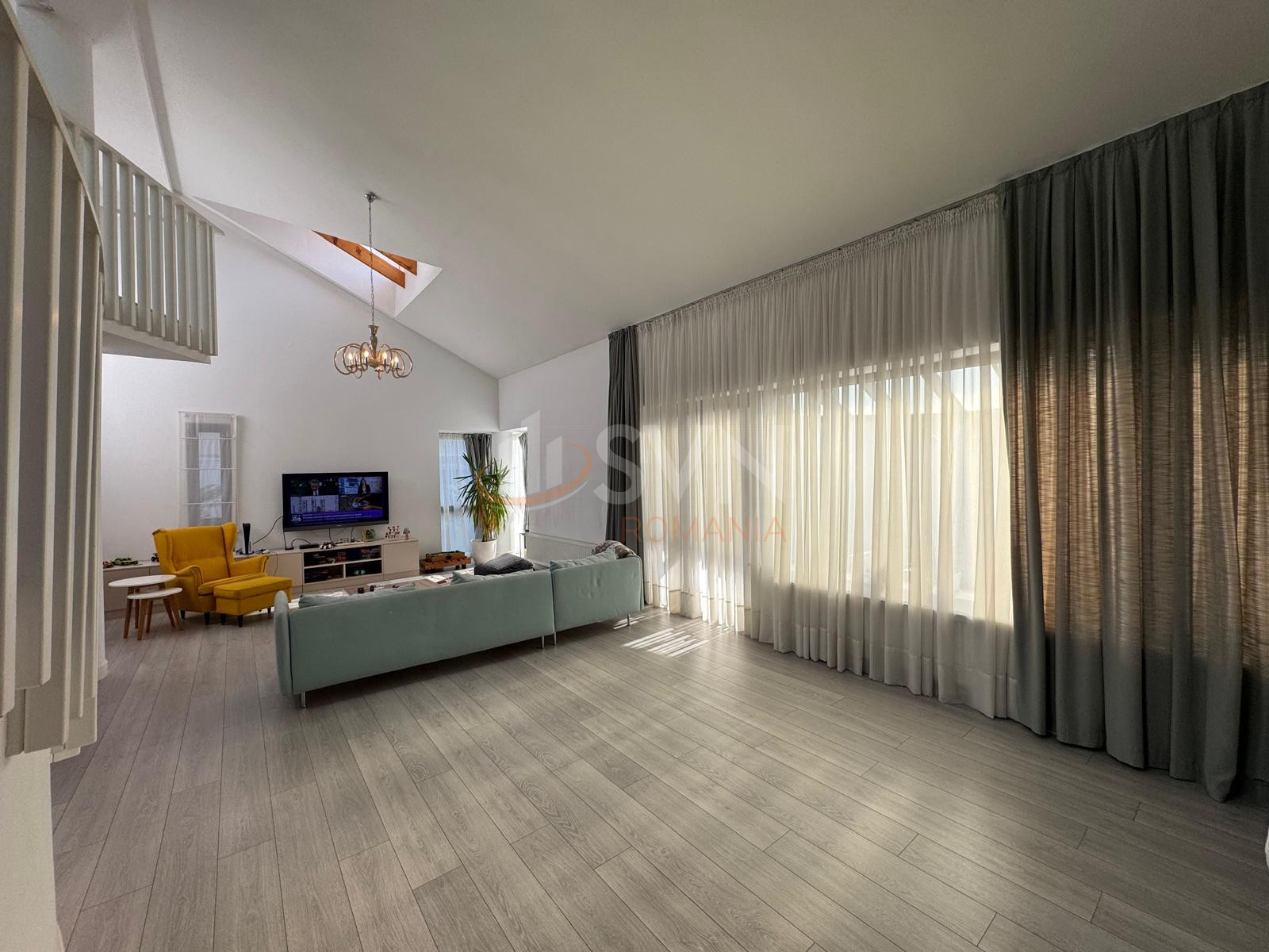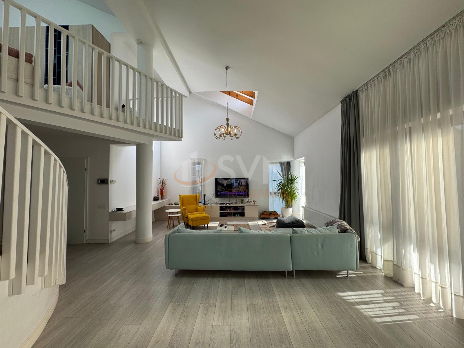 Un element arhitectural spectaculos il reprezinta scara interioara elicoidala, cu luminator, care devine punctul central al casei si confera un aer rafinat si exclusivist. Zona de living beneficiaza de suprafete vitrate ample, completate de un luminator, creand o ambianta luminoasa, relaxanta si primitoare.