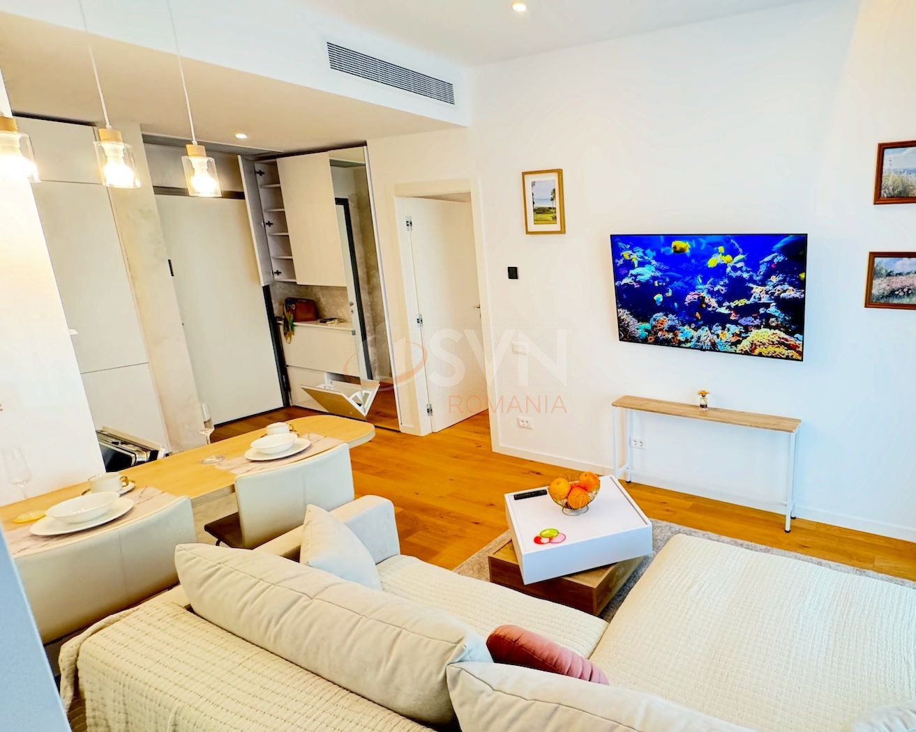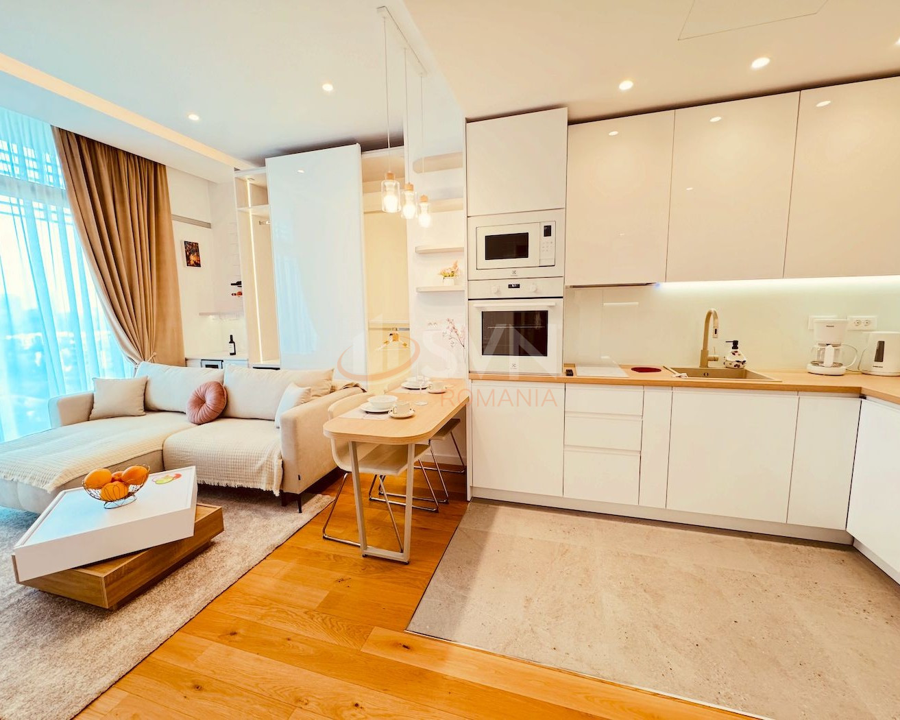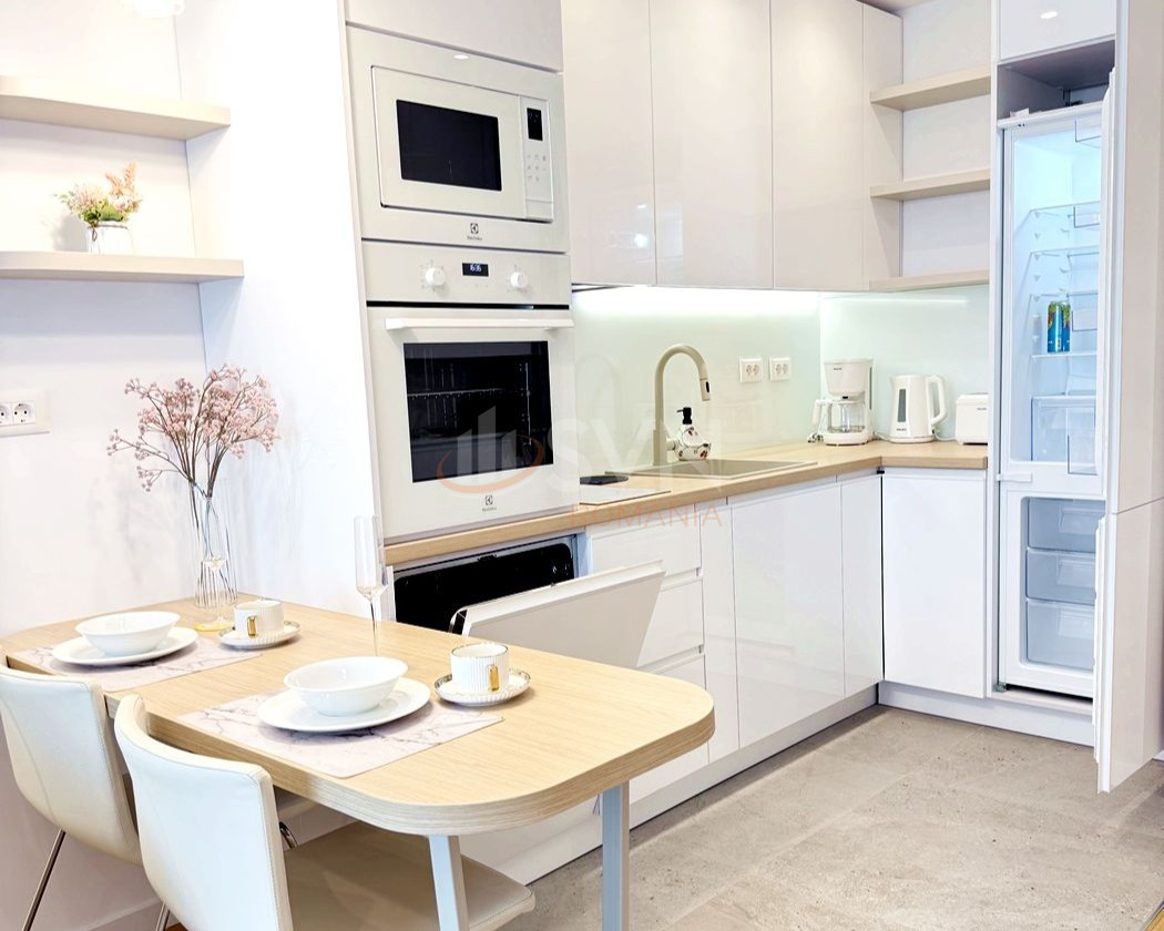 Zona de living este amenajată cu bun gust și include o zonă de bar cu frigider pentru vinuri, precum și un dressing generos, care oferă spațiu suplimentar de depozitare și contribuie la funcționalitatea excelentă a apartamentului. Bucătăria este complet echipată cu electrocasnice noi, încorporate, și răspunde perfect cerințelor unui stil de viață modern: