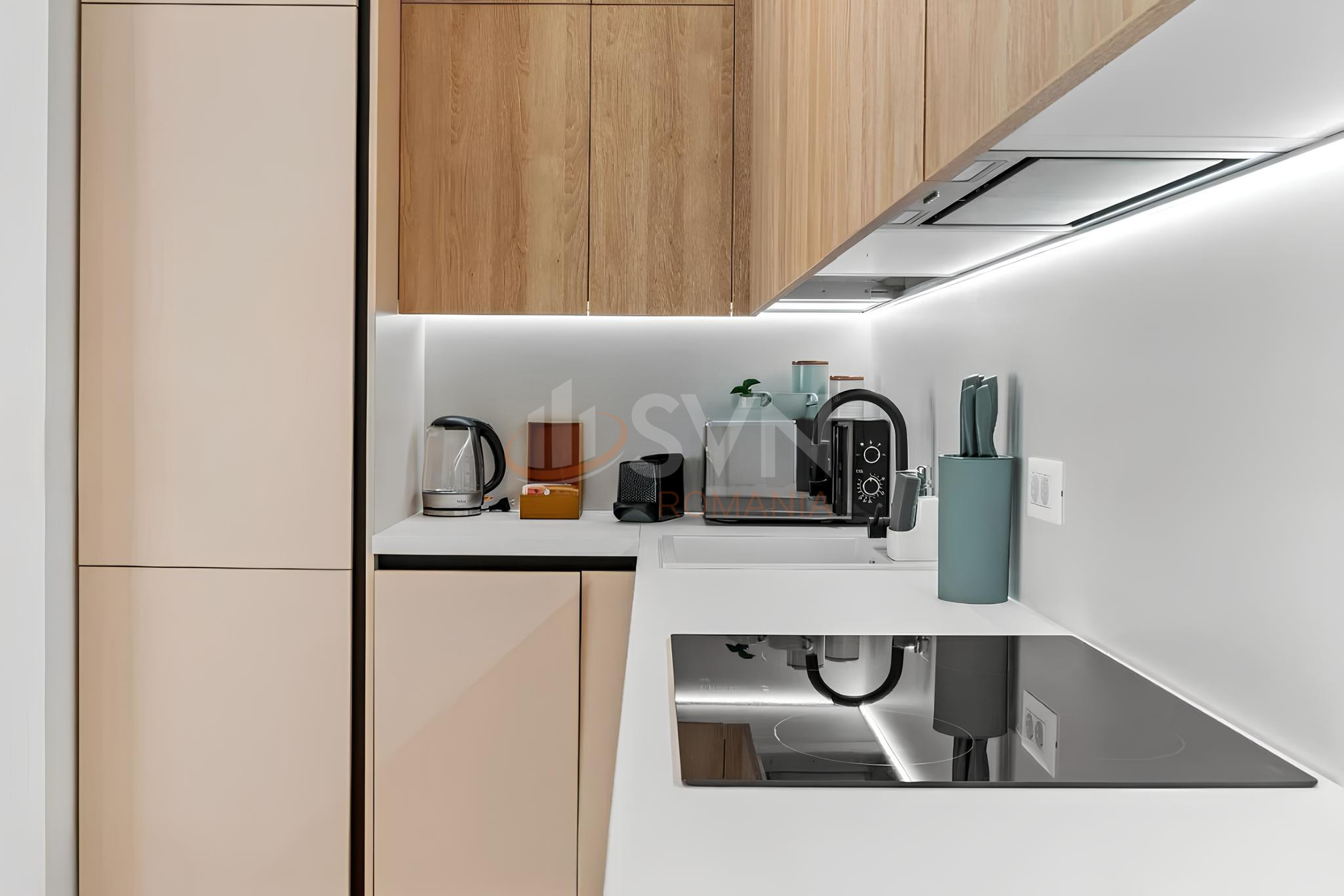 Bucataria open space este complet mobilata si utilata cu electrocasnice incorporabile de ultima generatie, inclusiv plita, cuptor electric si hota integrata discret. Mobilierul este realizat din materiale premium, cu fronturi in nuante neutre si texturi calde, care se imbina armonios cu parchetul din lemn stratificat. Zona de dining este amenajata elegant, cu masa rotunda si scaune moderne, situata langa peretele TV, integrat cu panou din lemn.
