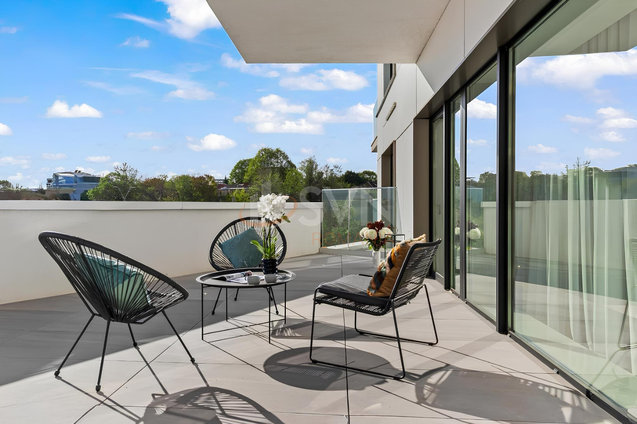 Terasa apartamentului este complet finisata, cu placi ceramice mari si zona verde decorativa cu pietris alb si plante ornamentale, oferind un spatiu exterior generos si privat. Este ideala pentru amenajarea unui lounge, a unei zone de servit masa sau pentru relaxare zilnica.