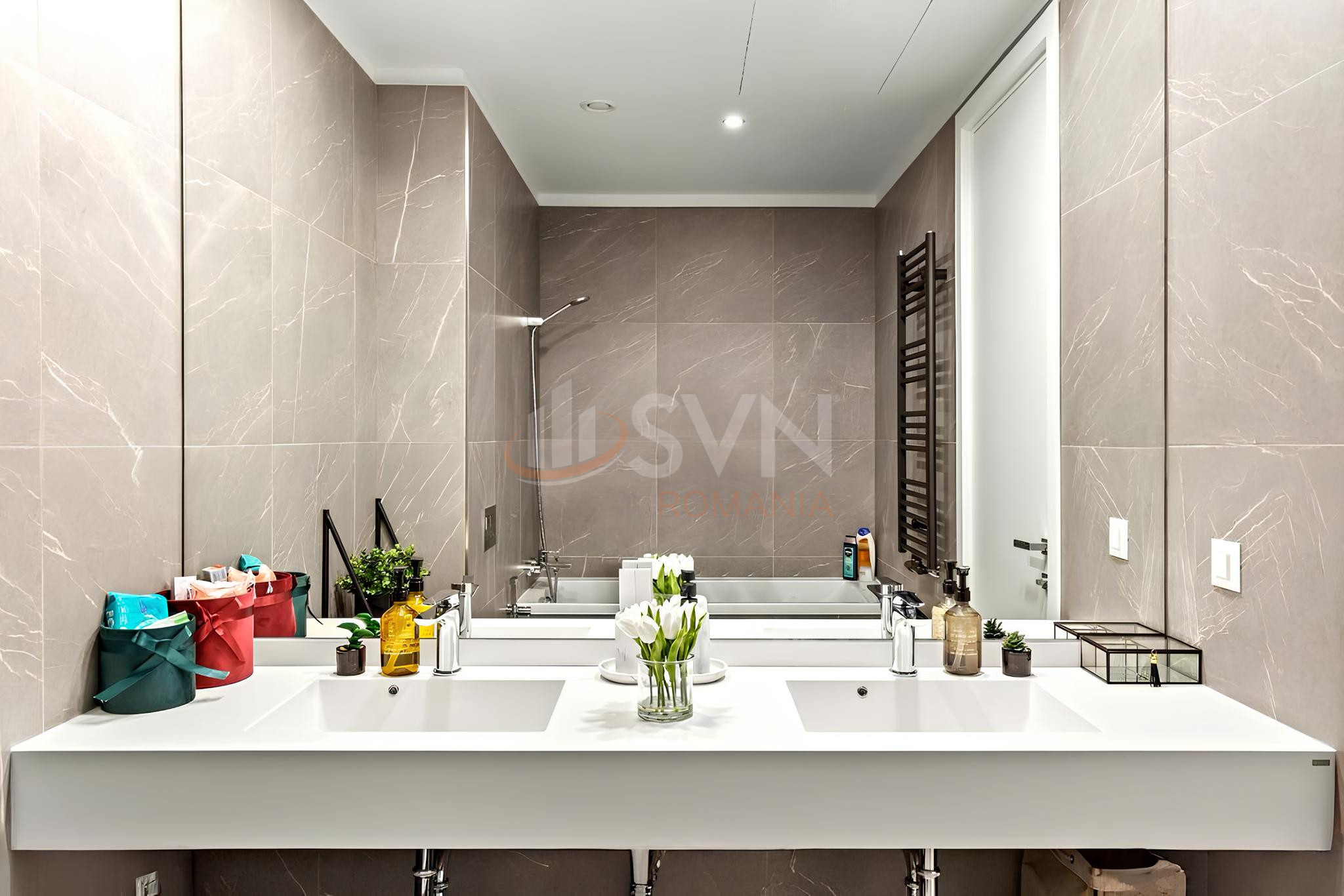 Dormitorul principal este amenajat cu un pat matrimonial tapitat, corpuri de iluminat suspendate si detalii decorative moderne. Peretii finisati cu vopsea decorativa in nuanta metalica si draperiile groase contribuie la o atmosfera intima si eleganta. Baile sunt complet echipate, cu lavoare duble, oglinzi mari, mobilier custom si finisaje ceramice de calitate superioara in tonuri neutre.