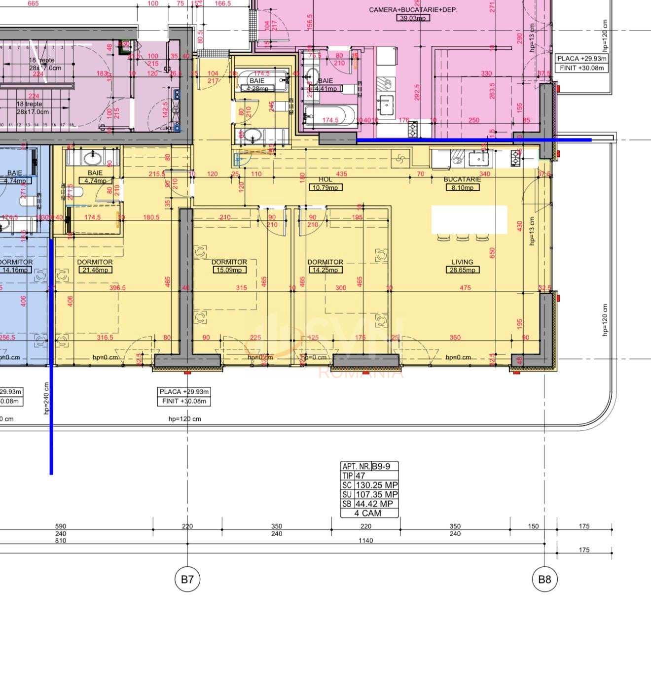 Apartamentul este situat la etajul 9 si are o suprafata construita de 130 mp, la care se adauga o terasa de 44 mp. Se vinde impreuna cu un loc de parcare sau mai multe, disponibile la pretul de 23.000 EUR + TVA fiecare.
