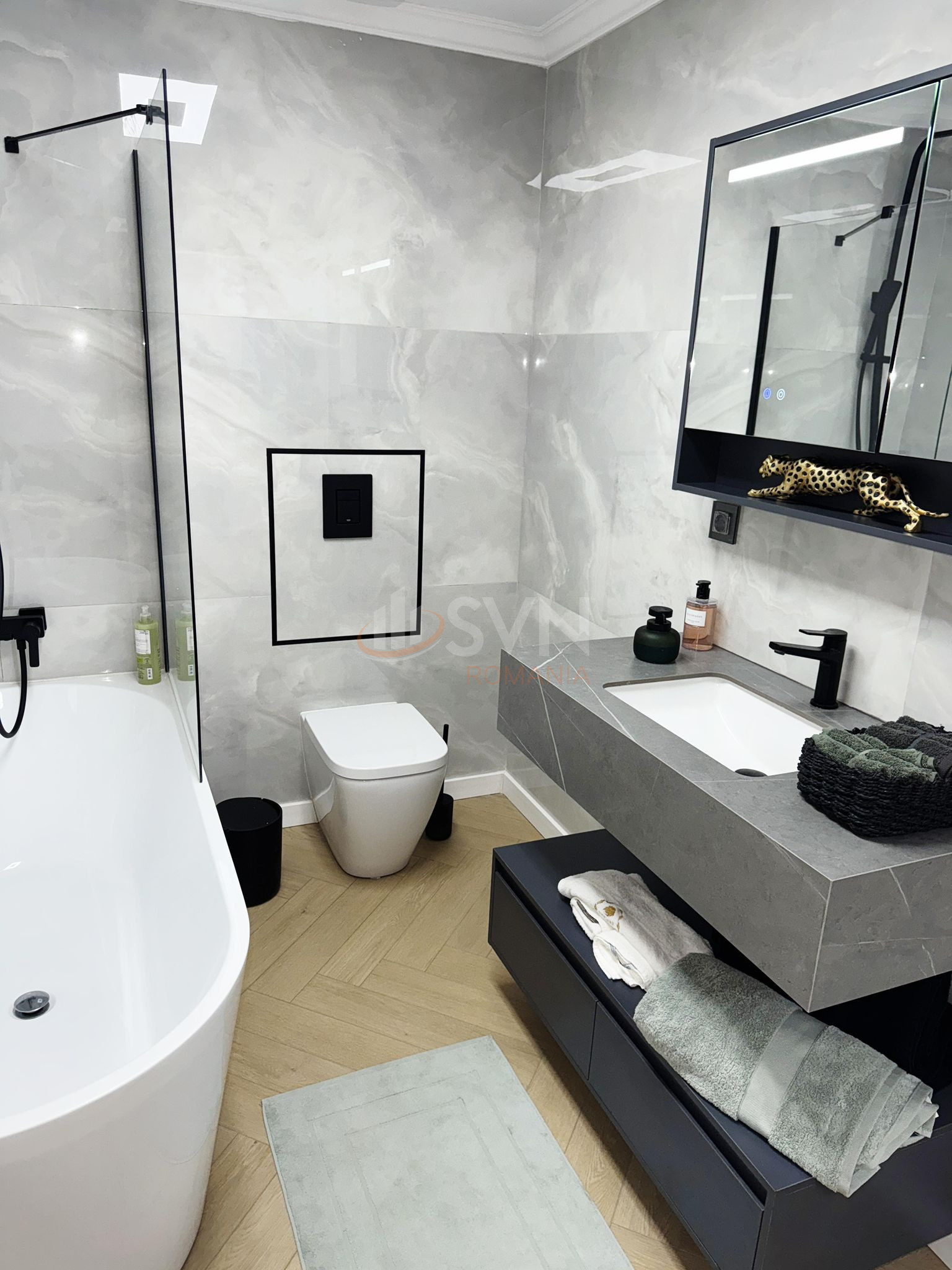 Finisajele sunt de inalta calitate: tavane suspendate din gips-carton cu spoturi incorporate si stucaturi decorative, usi interioare din lemn furnir abanos marca DRN Door, usi exterioare din otel, iar spatiile comune sunt placate cu marmura.