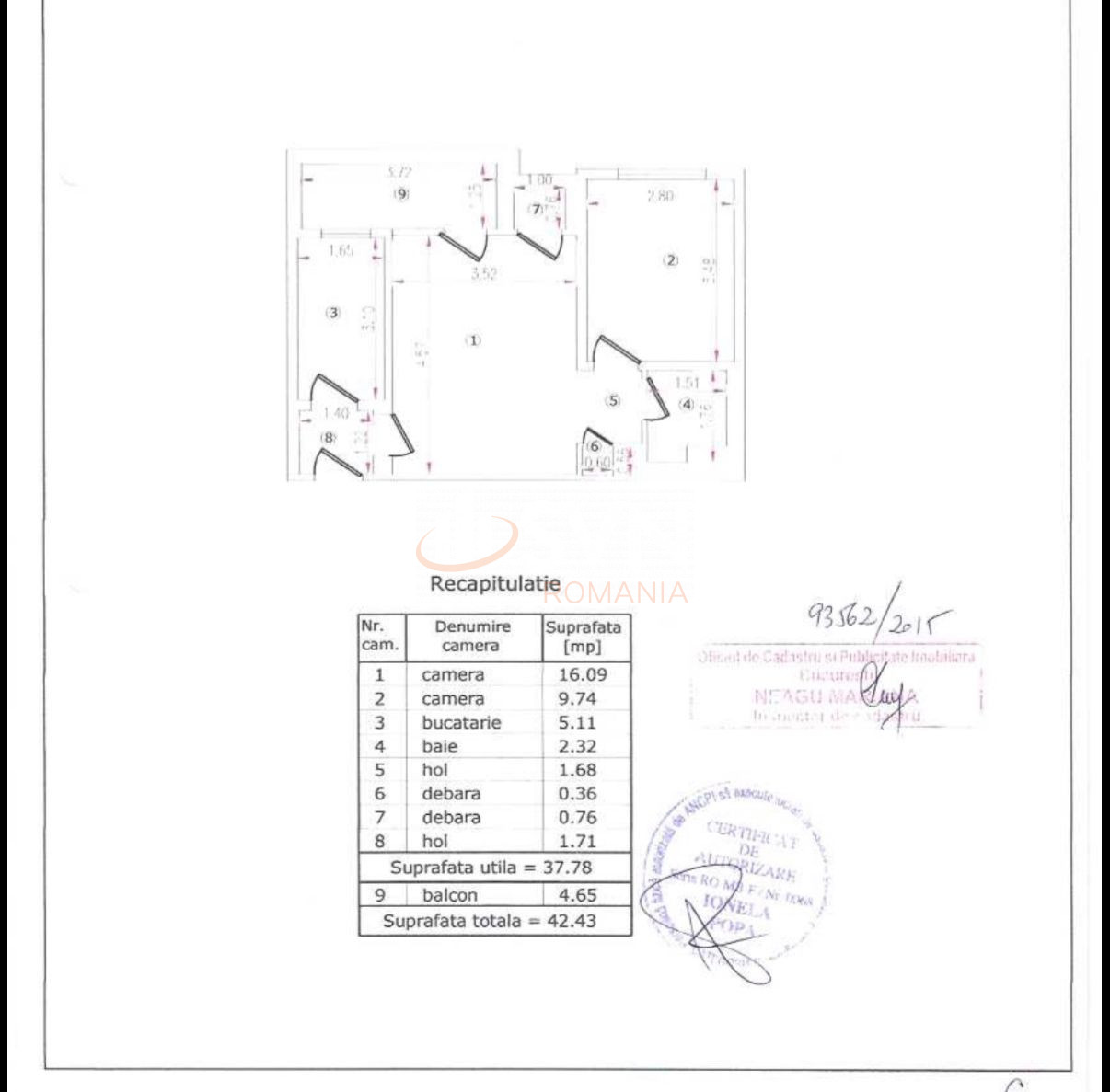 Imobilul dispune de o suprafata utila de 37,78 mp la care se adauga un balcon de 4,65 mp.