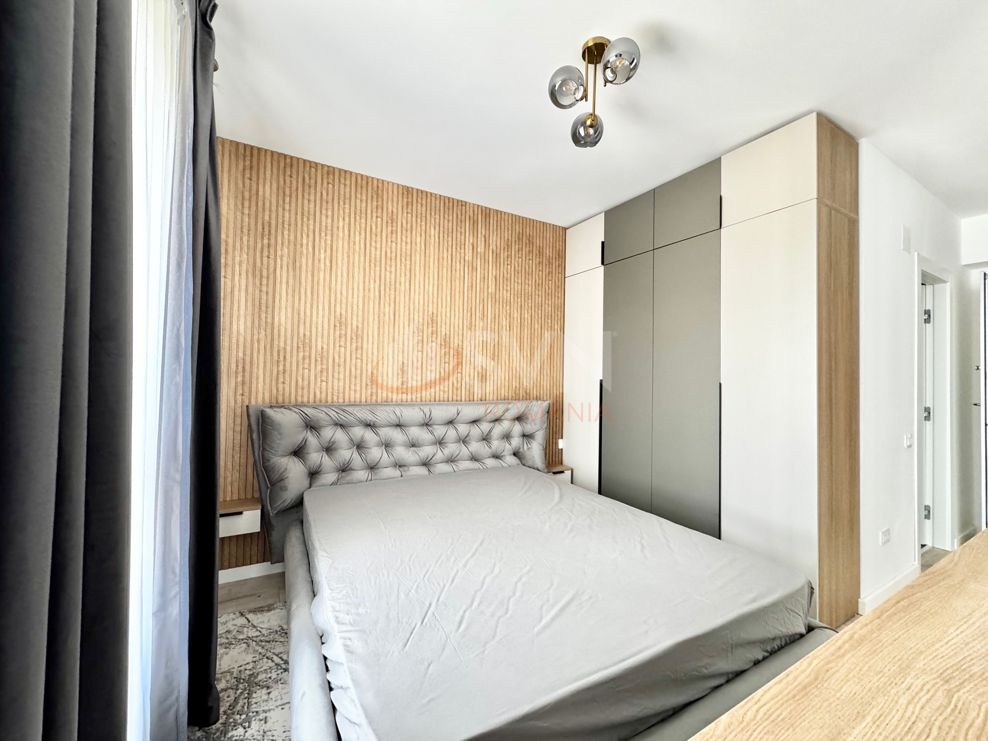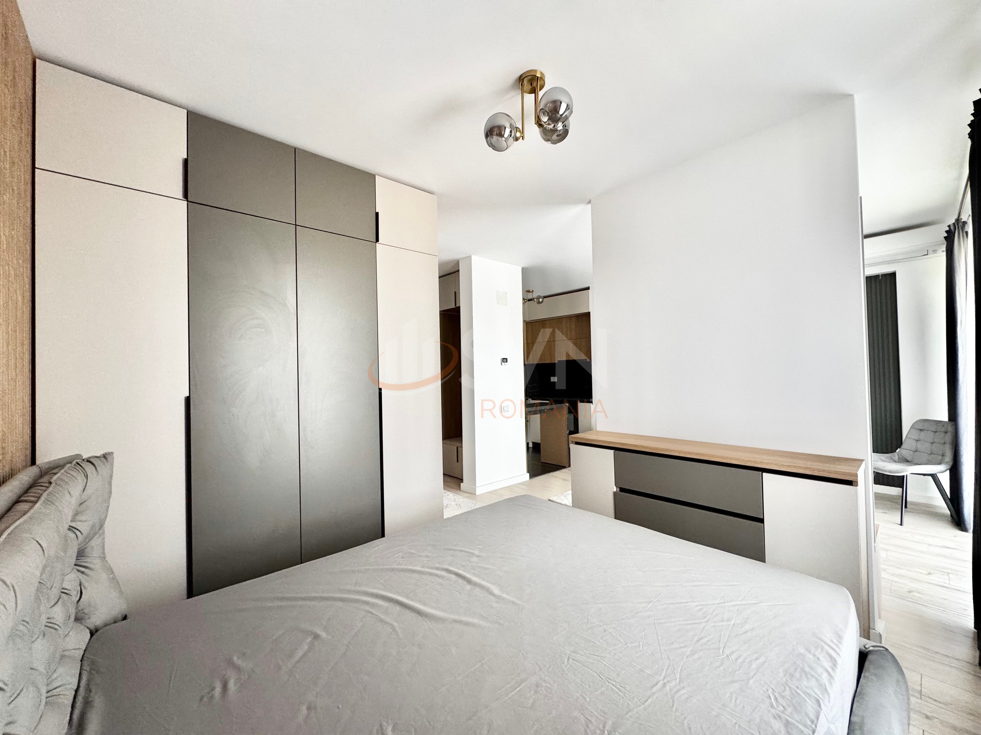 Dormitorul este un sanctuar de odihna, cu un design sofisticat si o atmosfera relaxanta. Dispune de un pat confortabil, dulapuri încorporate si acces la o baie dotata cu obiecte sanitare de calitate superioara si finisaje elegante.