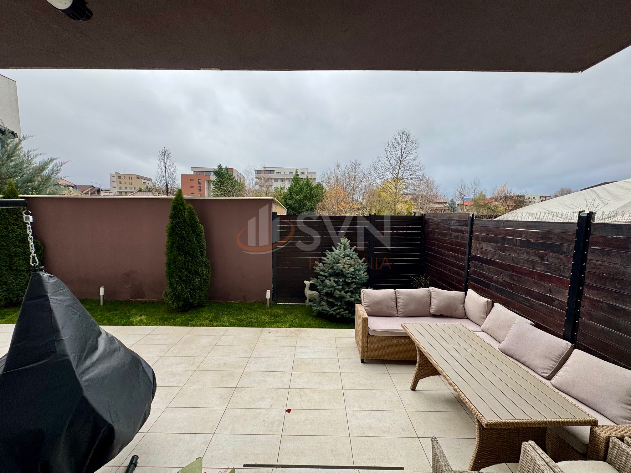 Apartamentul de tip semidecomandat dispune de living+bucatarie open space, doua dormitoare si doua bai, toate acestea insumand o suprafata de 73 mp la care se adauga gradina de 75 mp amenajata cu gazon, tuia, mobilier terasa , balansoar, oferind apartamentului confortul unei case.