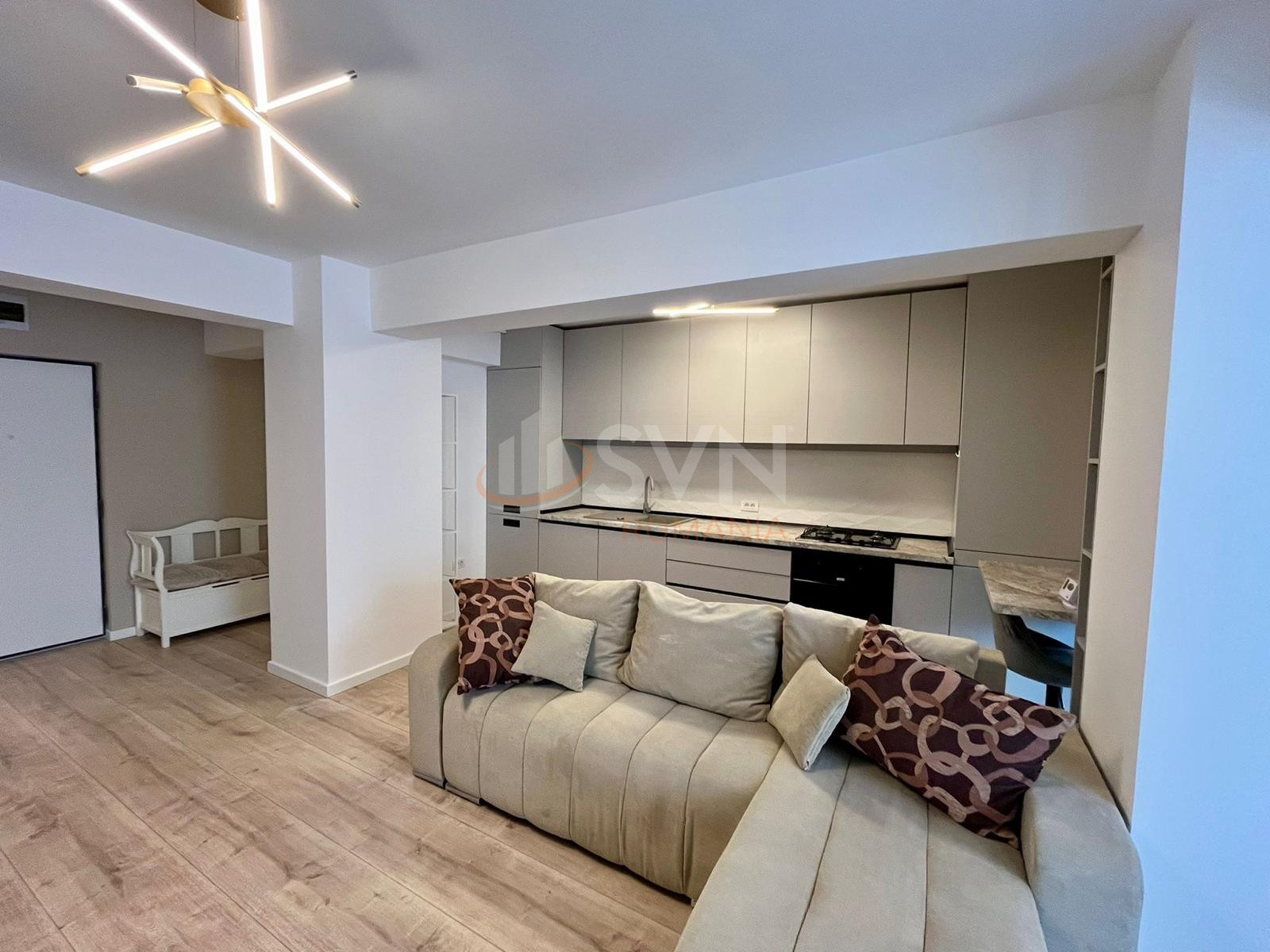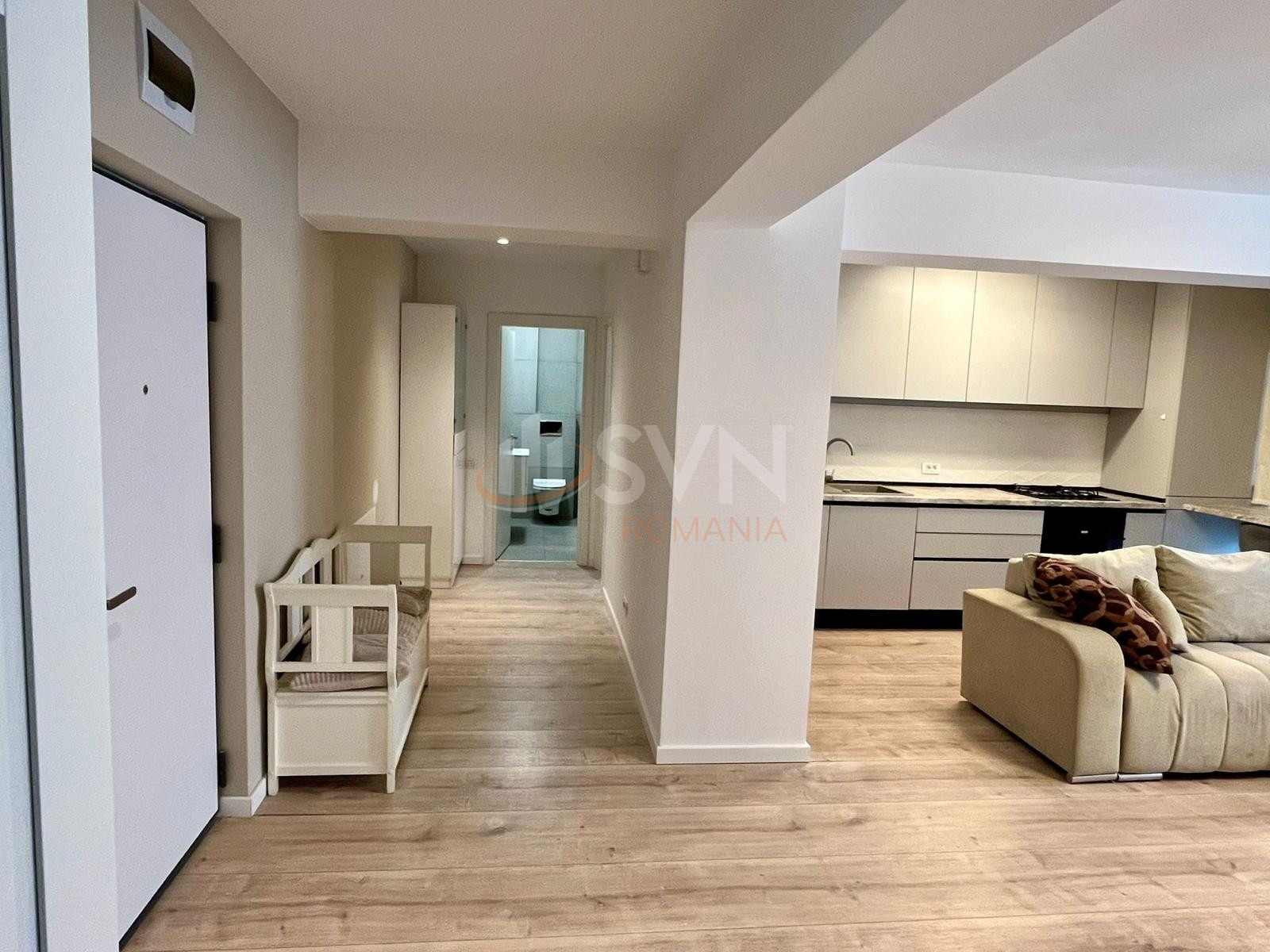 Apartamentul se vinde complet mobilat si utilat, cu mobilier personalizat, incluzand paturi duble, dressinguri generoase, canapea extensibila si masa de dining. Bucataria este complet echipata cu plita, hota, cuptor si frigider.