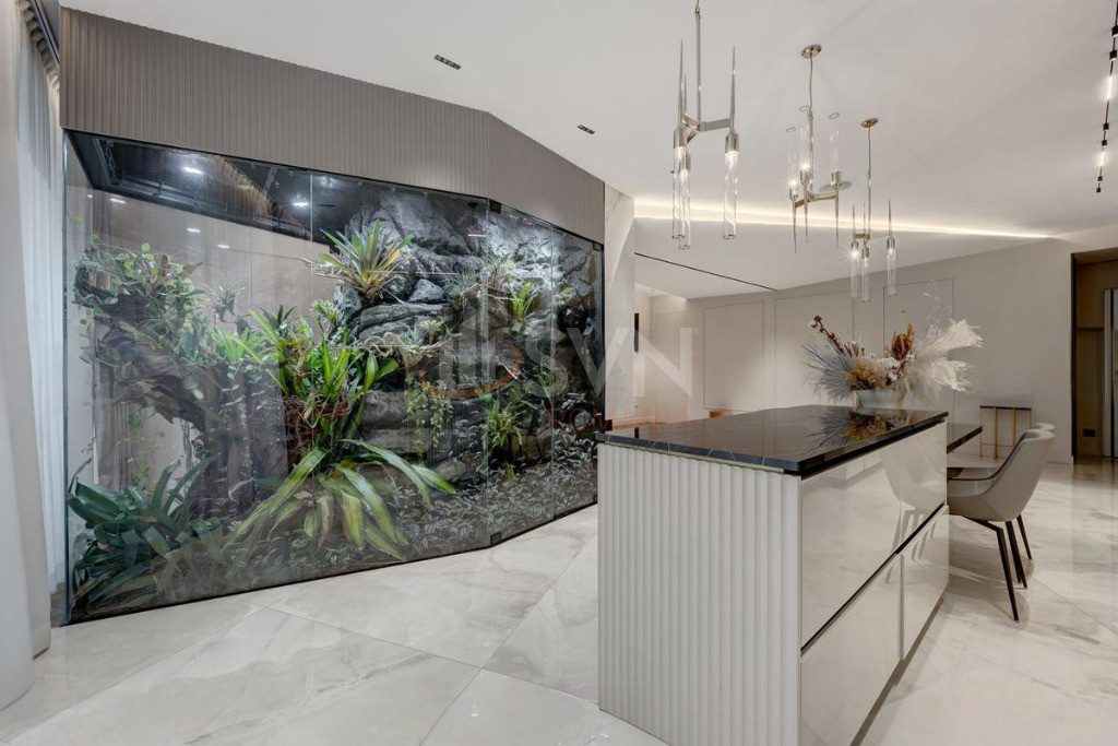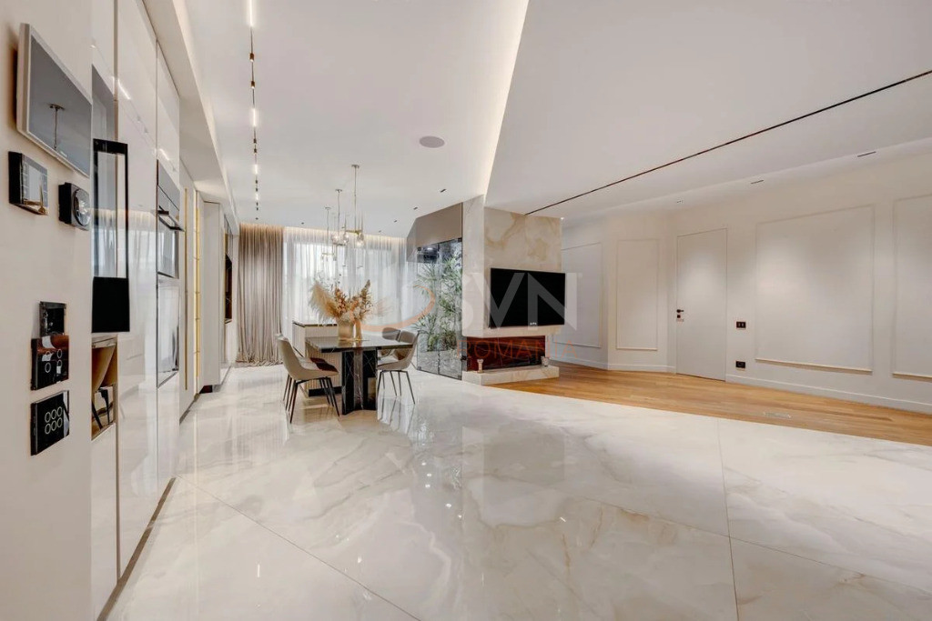Apartamentul a fost complet personalizat, toate finisajele standard fiind inlocuite cu materiale premium, atent selectionate, de cea mai buna calitate. Proprietatea este dotata cu sistem smart home, care permite controlul iluminatului, climatizarii si altor functii esentiale, oferind un nivel superior de confort, eficienta si siguranta.