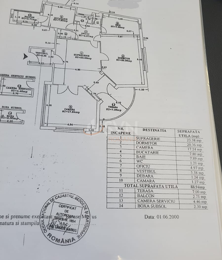 Apartamentul este amplasat la etajul 1 al unui imobil construit in anul 1935, care a fost consolidat in 1994 si nu prezinta risc seismic, oferind astfel siguranta si stabilitate. Spatiul interior este generos si bine compartimentat, avand o suprafata utila de 88,94 mp, la care se adauga doua balcoane, o camera de serviciu si o boxa la subsol. Compartimentarea include trei camere mari, o bucatarie si doua bai, apartamentul oferind confort si functionalitate pentru o familie sau pentru diverse tipuri de amenajari.