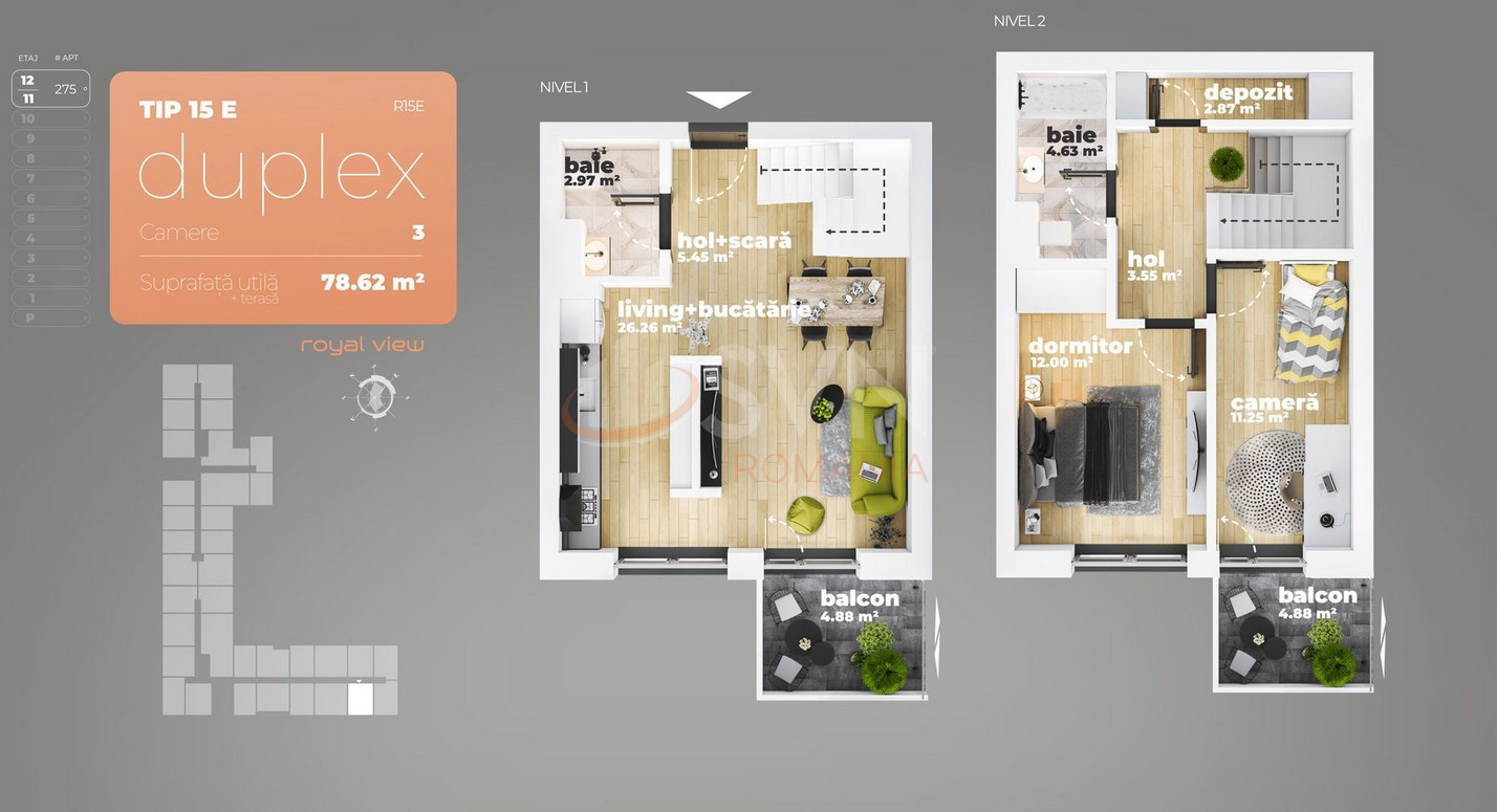 SVN Pipera offers you a superb 3-room duplex apartment, located in the southern part of the city, in the Royal View complex, just a 12-minute walk from Piata Sudului metro station. The apartment is modern, with an elegant design, large windows and balconies offering a beautiful city view, and is situated on the 11th and 12th floors.