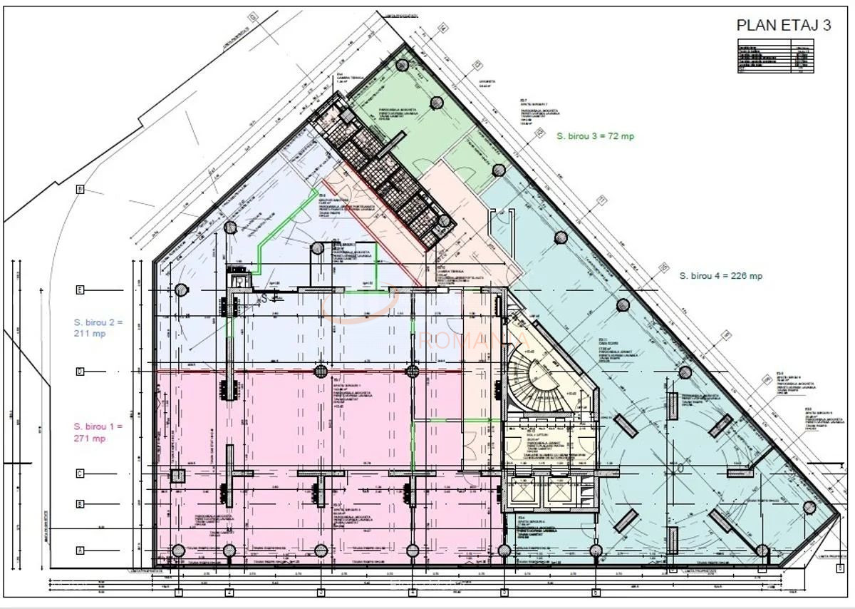 Spatiul este situat la etajul 3/6, intr-o cladire de birouri construita in anul 2005 si dispune de o suprafata partiala totala de 526 mp.