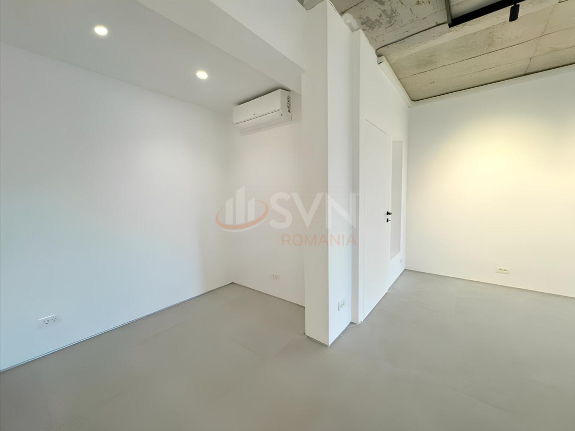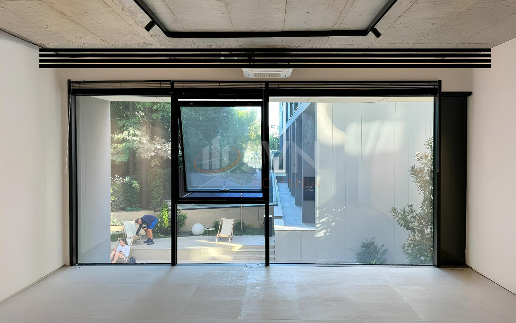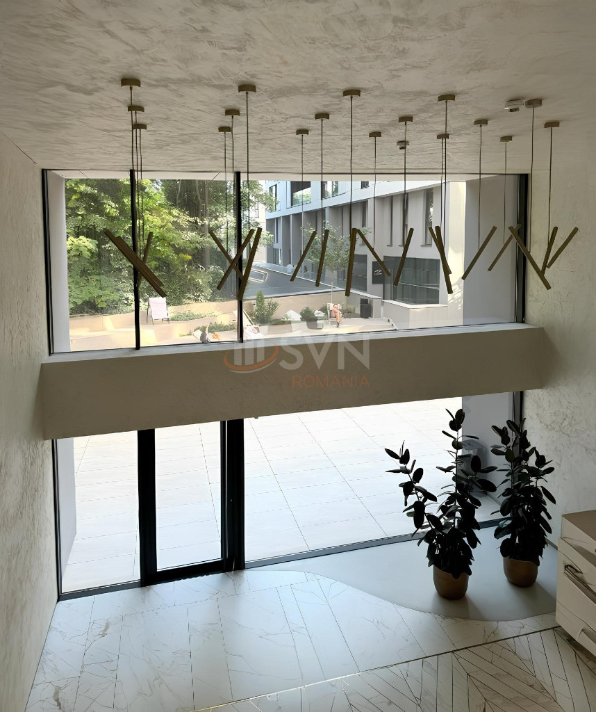 The property benefits from a prime position overlooking the piazza of the Win Herăstrău complex, visible through its generous glazed surface.
