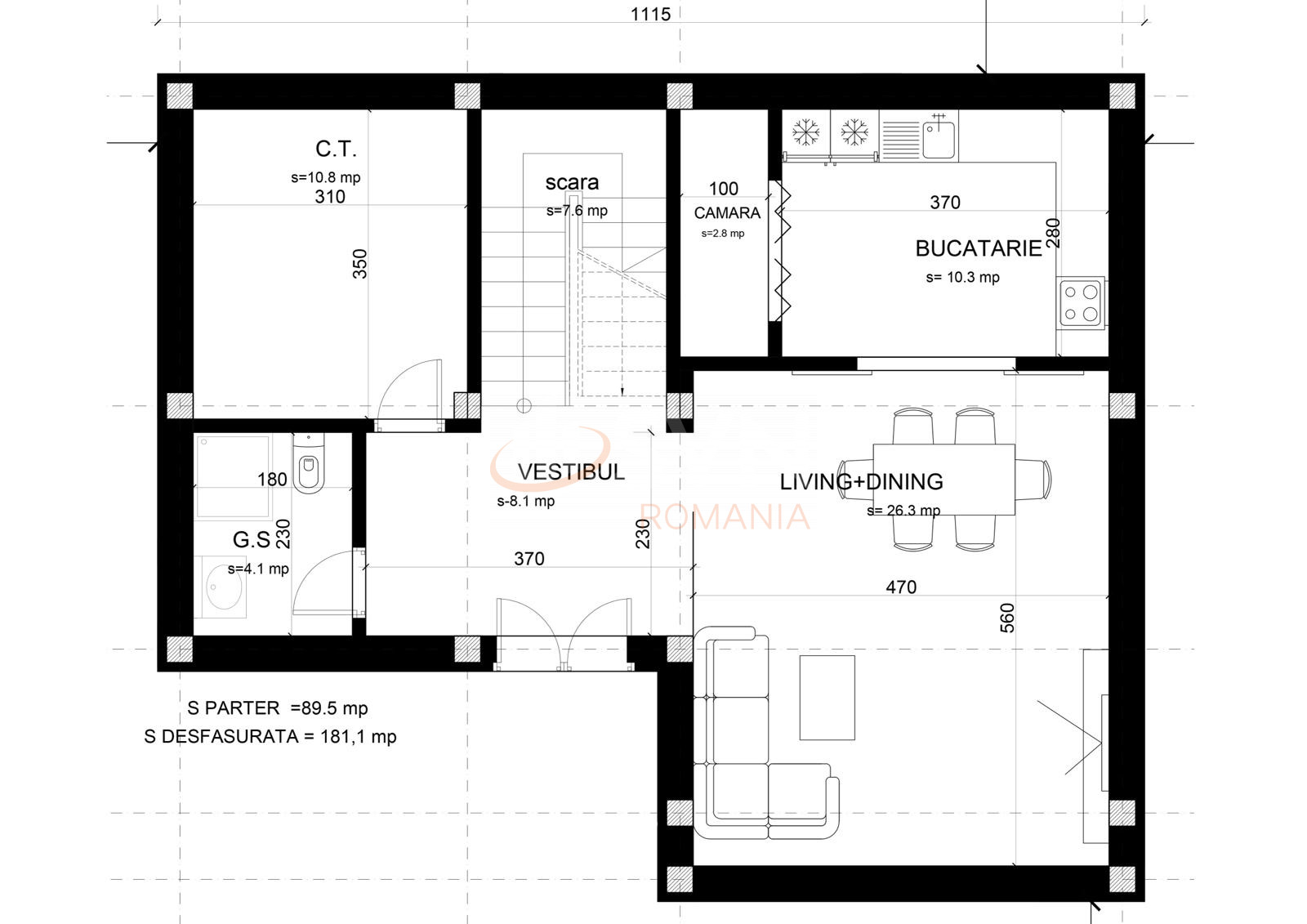 living si bucatarie open-space, cu o suprafata generoasa de 39,5 mp, ideala pentru momentele petrecute in familie,