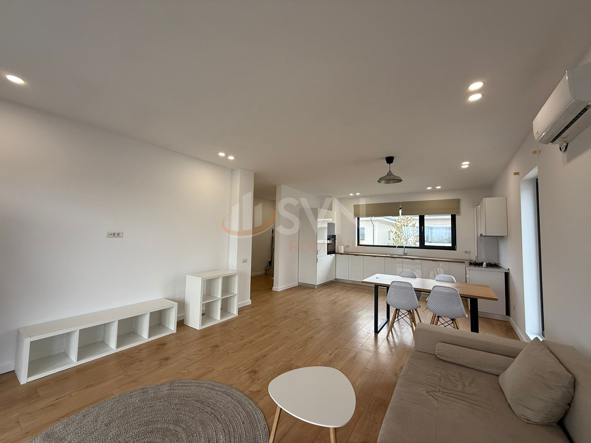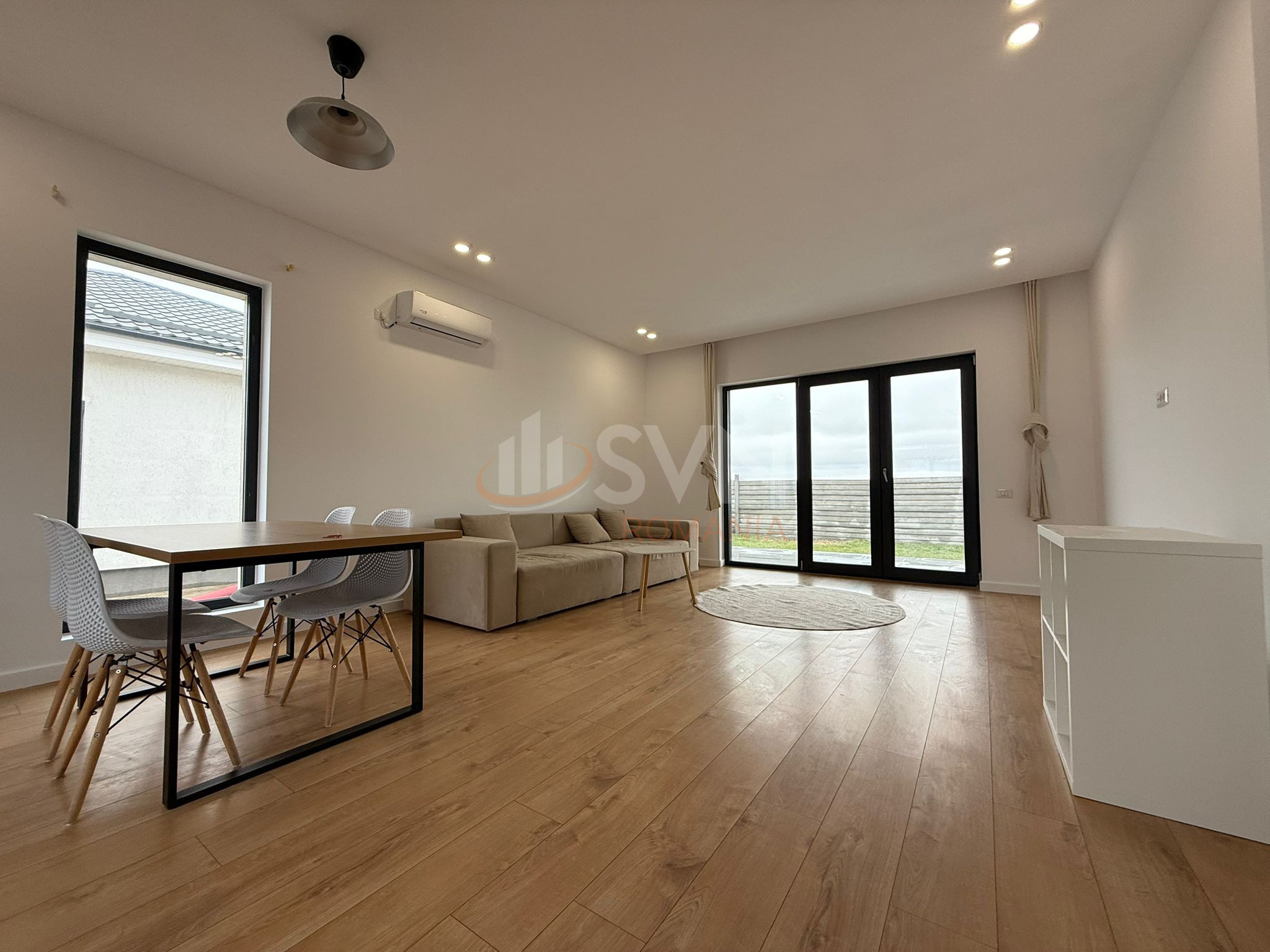 Un living generos de 37 mp cu bucatarie open space si zona de dining , din care se face iesirea pe o terasa amenajata, o baie cu dus si un hol ce deserveste dormitorului, baii si celei de a treia camera facand aceasta casa ideala pentru o familie fiind situata intr-o comunitate cu acces securizat.