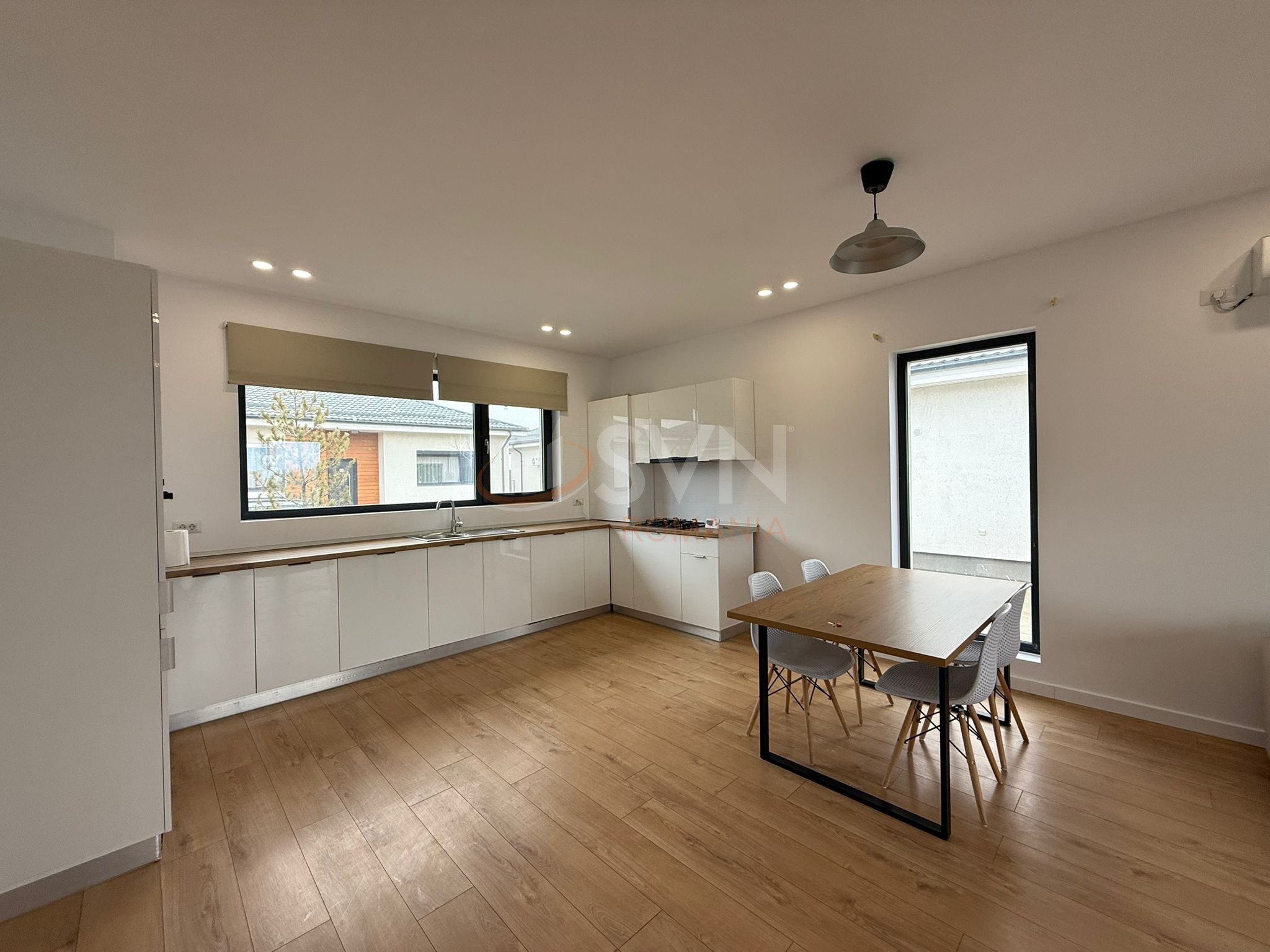Casa se vinde mobilata si utilata cu mobilier de cea mai buna calitate conform pozelor cu livingul amenajat si dinnig cu bucatarie open- space, iar dormitorul matrimonial este mobilat.