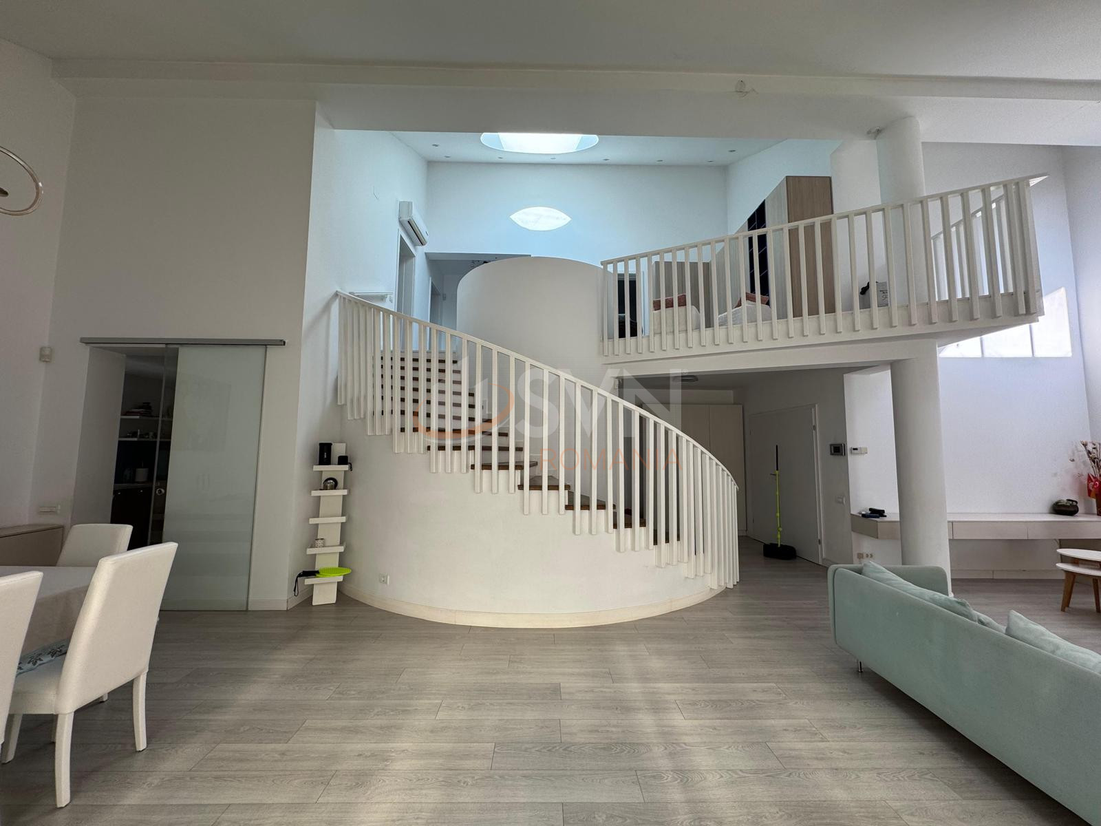 Un element arhitectural spectaculos il reprezinta scara interioara elicoidala, cu luminator, care devine punctul central al casei si confera un aer rafinat si exclusivist. Zona de living beneficiaza de suprafete vitrate ample, completate de un luminator, creand o ambianta luminoasa, relaxanta si primitoare.