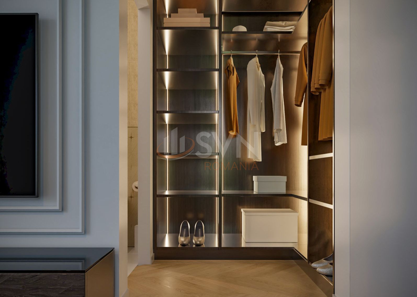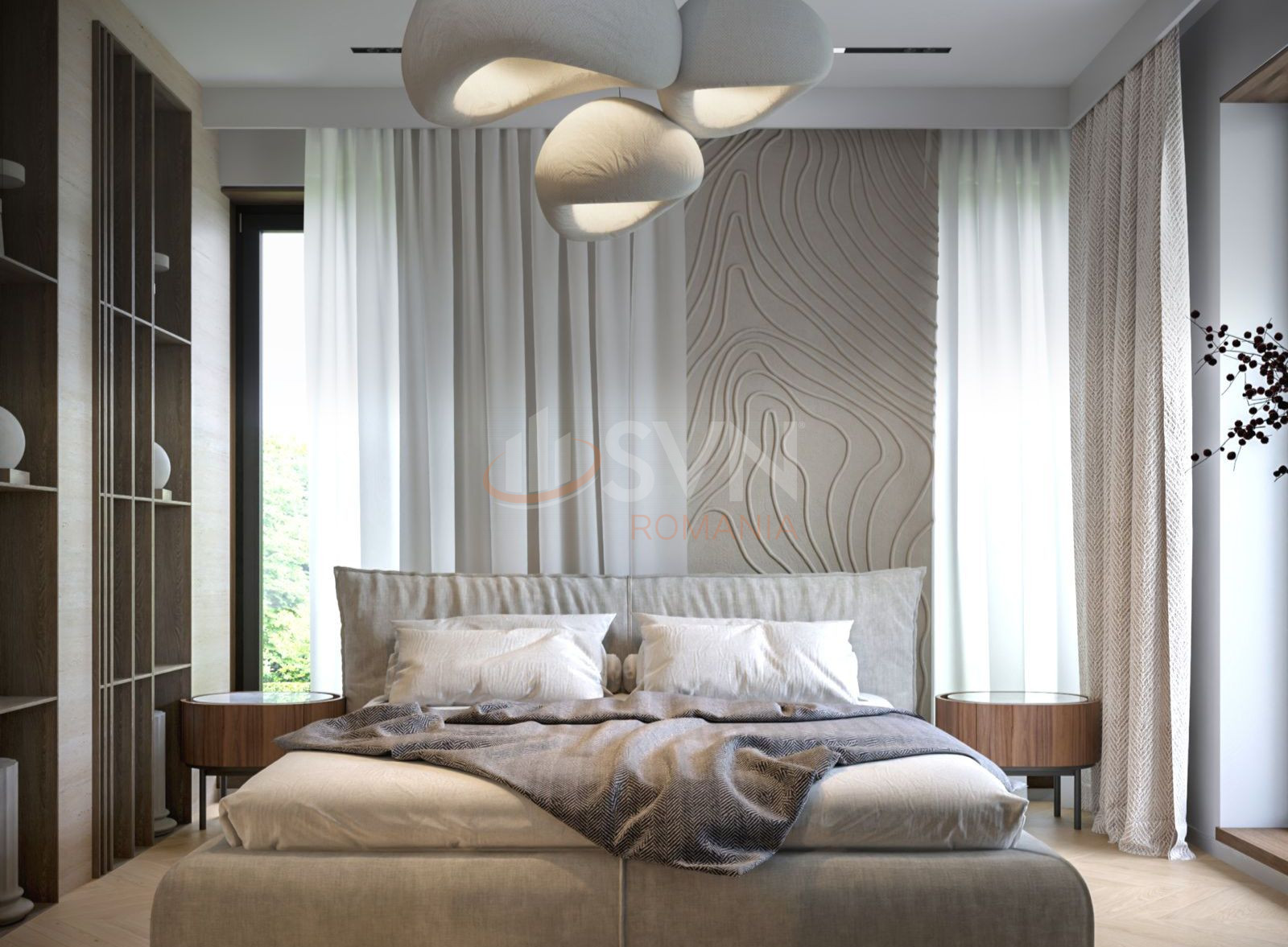 La etajul 1, zona de noapte ofera intimitate si confort absolut. Se regasesc doua dormitoare spatioase, fiecare cu dressing si baie proprie. Baile sunt finisate cu ceramica de top si obiecte sanitare premium. Toate camerele sunt luminoase, cu ferestre ample si finisaje rafinate.