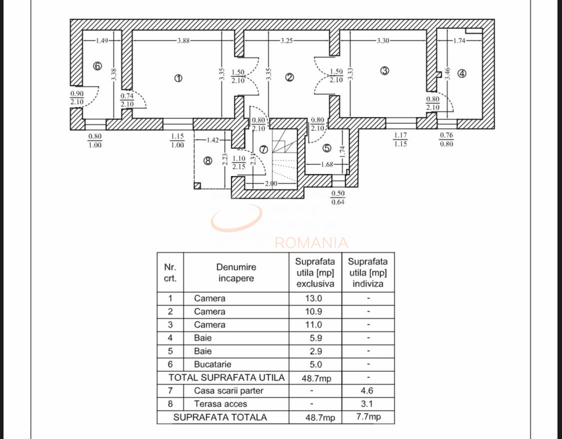 •Apartament parter (Ap. 1) – 48.7 mp utili (3 camere, 2 bai, bucatarie)