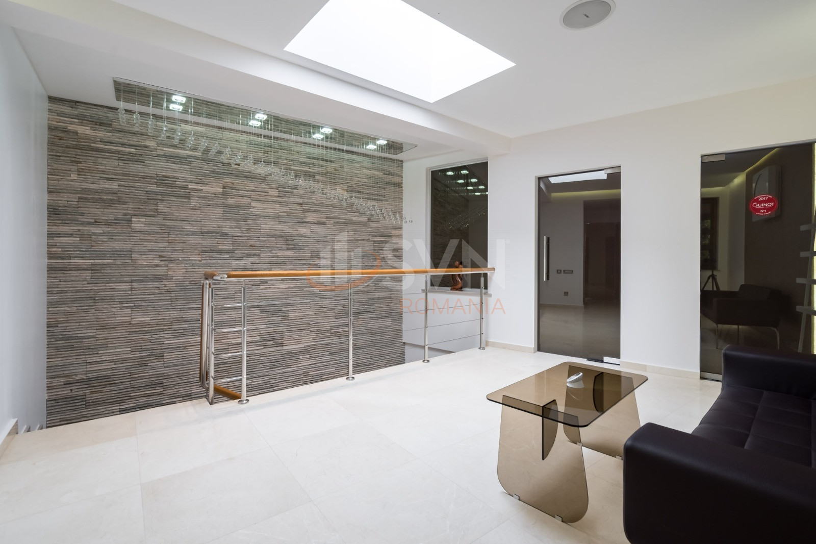 Vila dispune de 5 camere spatioase, o zona de receptie, bucatarie complet echipata, spatiu de asteptare si 2 bai. Finisajele interioare sunt deosebit de rafinate, incluzand pereti placati cu piatra Quartit Titanium, tavane instelate cu iluminare LED multifunctionala controlata prin telecomanda, candelabre din fibra optica si cristale Bohemia, tavane extensibile Barisol cu iluminare variabila, precum si sisteme de climatizare LG ARTCOOL GALLERY si ARTCOOL STYLIST cu iluminare LED integrata. Atmosfera este completata de sistem audio ambiental BOSE si multiple alte detalii premium.
